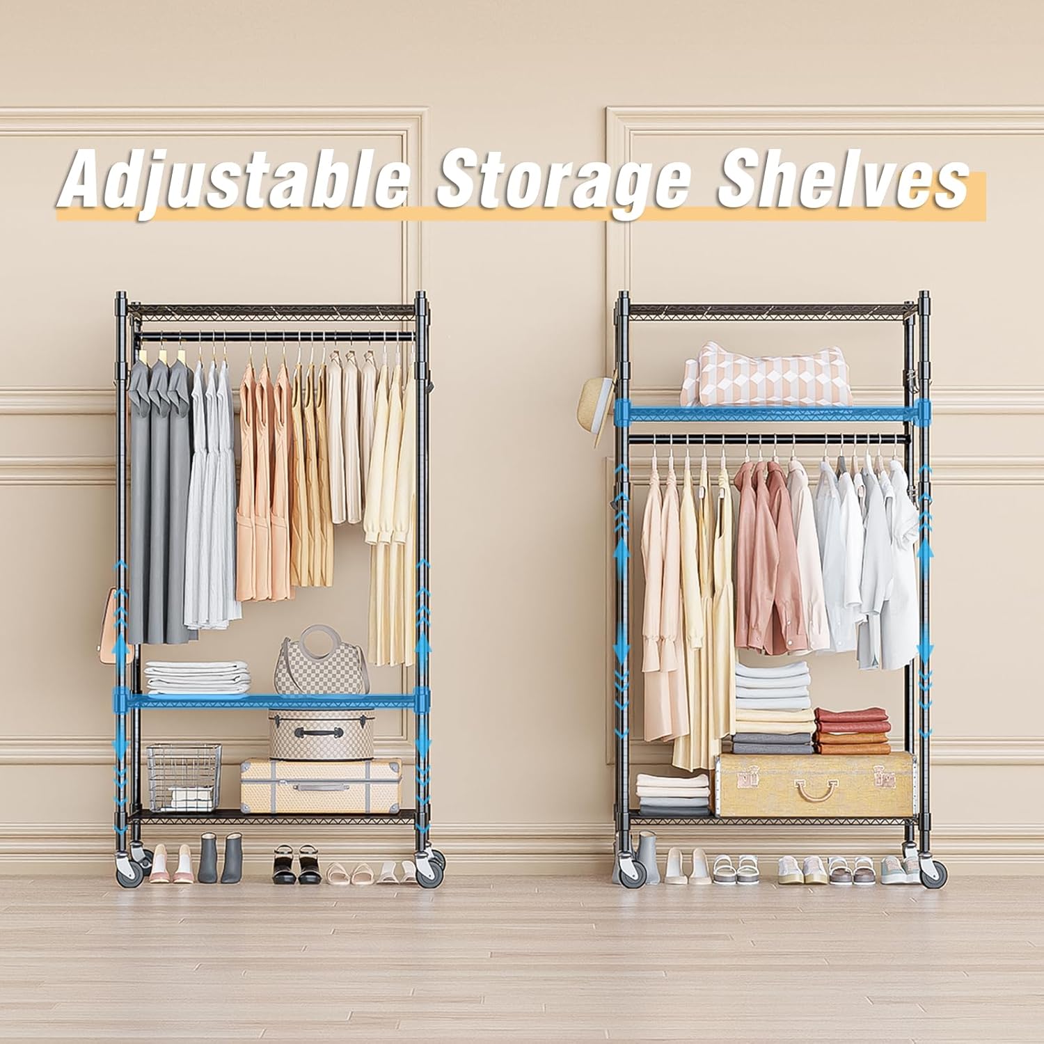 - 【Strong Storage Capacity】 3 Tiers clothes racks and 2 hanging rods offers you various storage area. The shelves can be adjusted up and down, or remove for your needs, to store difference sized items. Easily maximize your storage space by providing shoes storage, hang storage, folded storage