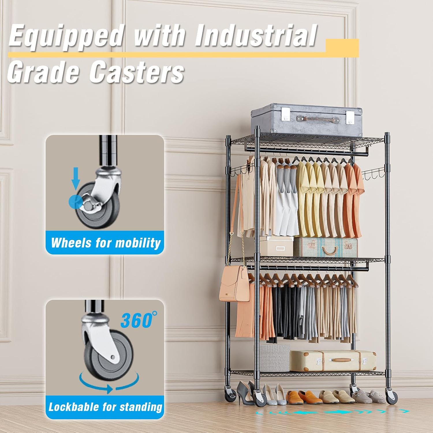 - 【LOCKABLE 360° WHEELS】 Equipped with 4 rolling wheels, 2 of them are locking wheels, designed to allow you to roll this clothing garment rack where ever you need in home. Easy access to bedroom, cloakroom, clothing store, laundry room, walk-in closet and more