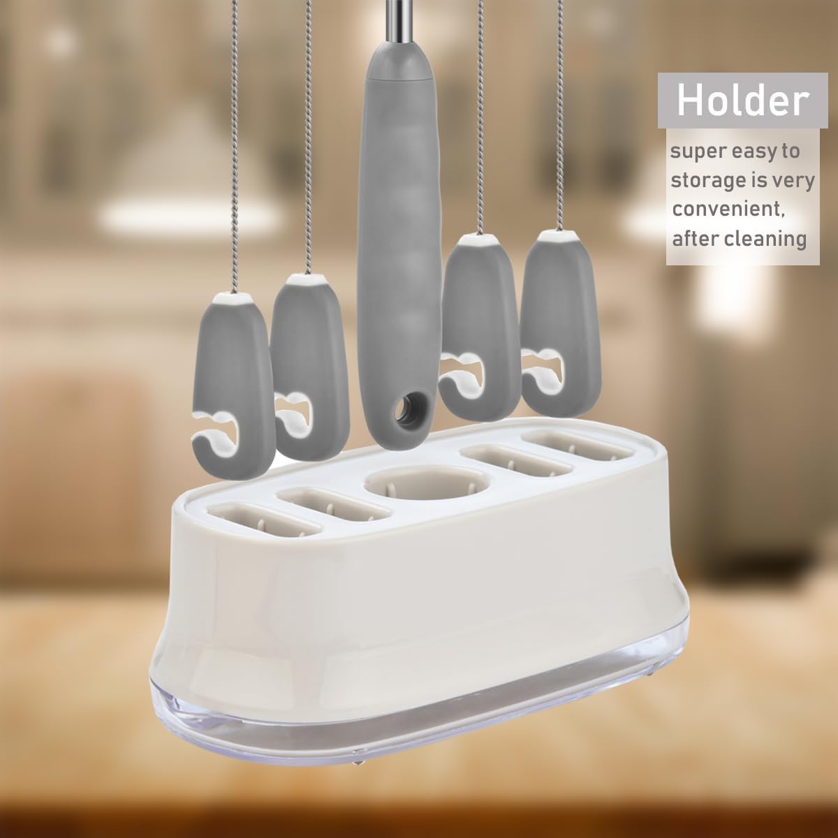 - BRUSH SET WITH HOLDER - Get 5 counts brush, 1 long bottle brush, 1 long wide straw brush, 1 narrow pipe cleaner, 1 lid brush, 1 detail brush and 1 drainage stand. This all-in-one set has everything you need to get bottles and straws squeaky clean.