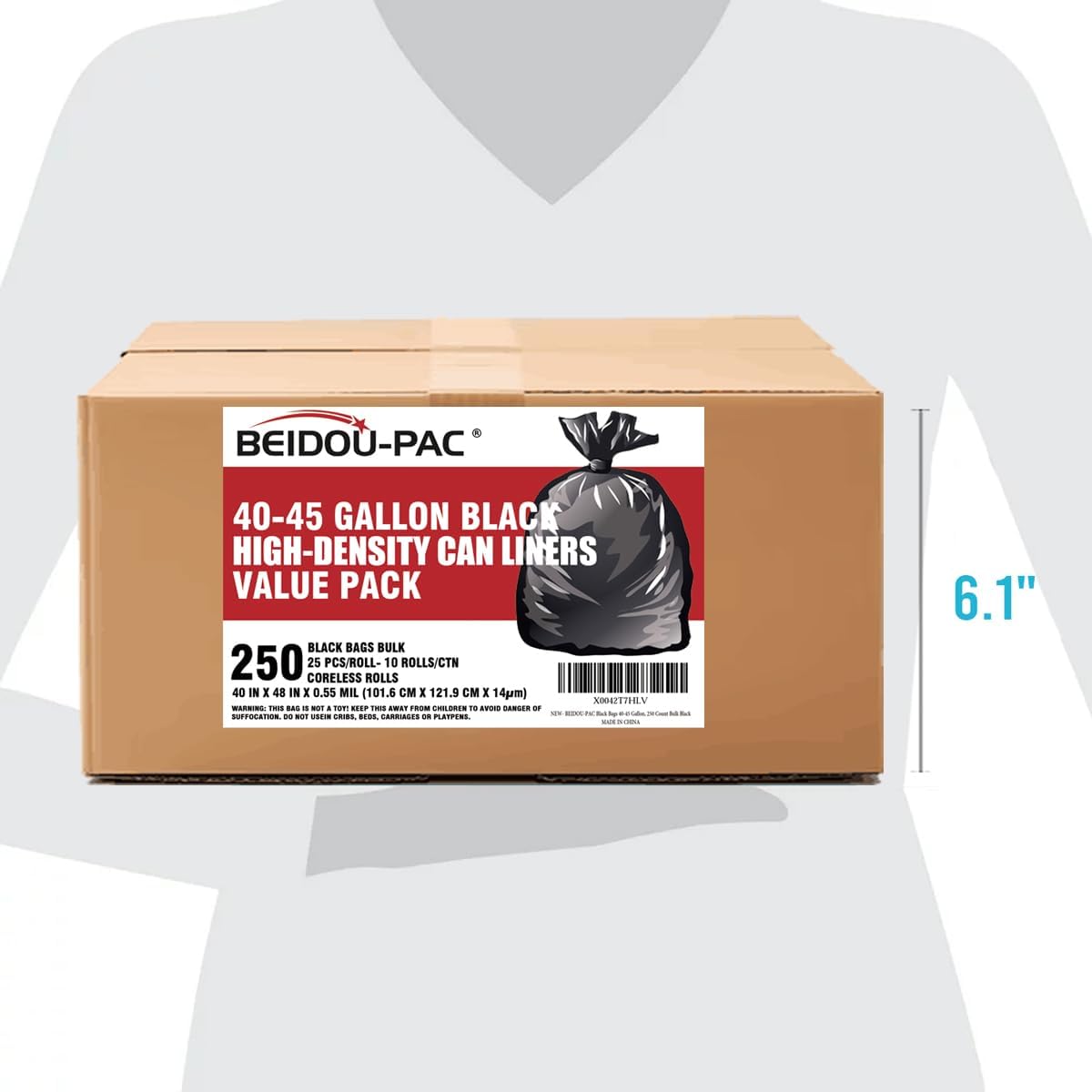 - 1, Product information: BEIDOU-PAC 40-45 gallon large balck plastic recycling trash bags, Size: 40" x 48"x 14 mic, Total 250 bags bulk (25 PCS/ROLL, 10 CORELESS ROLLS/CTN), Perfect for 40-45 Gal Capacity Office, commercial, industrial, or residential waste.