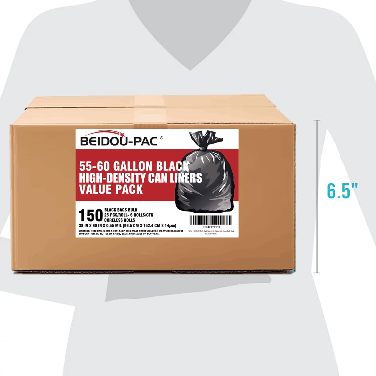 - 1, Product information: BEIDOU-PAC 55-60 gallon large black plastic recycling trash bags, Size: 38"* 60"x 14 mic, Total 150 bags bulk (25 PCS/ROLL, 6 CORELESS ROLLS/CTN), Perfect for 55-60 Gal Capacity Office, commercial, industrial, or residential waste.