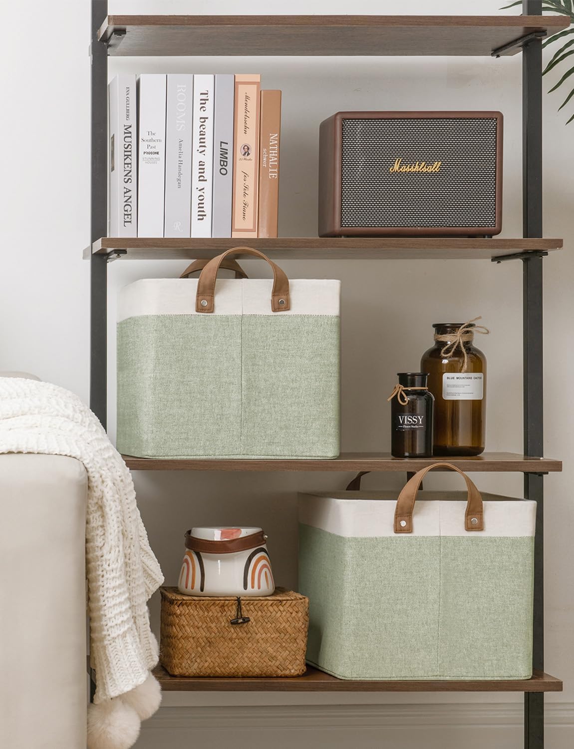 StorageWorks Storage Bins, Fabric Storage Bins for Shelves, Large Storage Baskets with Metal Frame, Closet Baskets and Bins with Handles, Green and White, 2-Pack