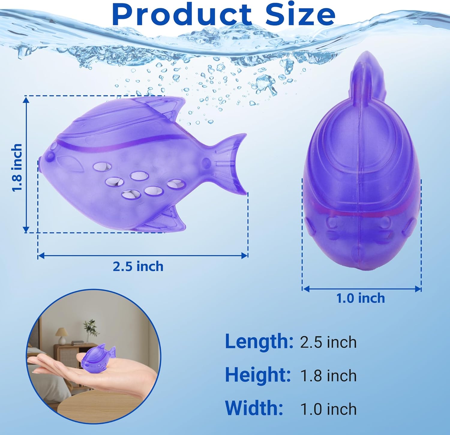 - πππ¦π¬ π§π’ π¨π¦π - Package includes 12 x purple humidifier fish. Size: 1.8 x 2.5 inches. Easy to replace and no tools required. Simply put the humidifier cleaner in your humidifier or fish tank (pay attention to the opening size) and you can get cleaner air and a healthier living environment. Long-term cleaning, we recommend using 2 humidifier cleaning fish per tank and changing it every 30 days for consistently higher air quality