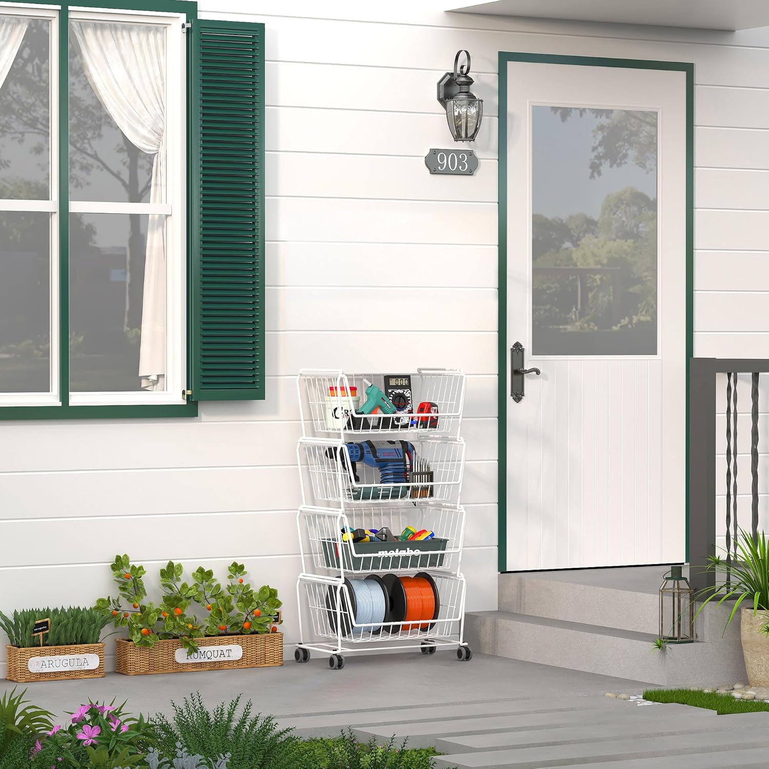 - 【Suitable Capacity】Each individual basket size: L17''x W11.5''x H8'', 4 tier storage rack set (wheels included) size: L17''x W11.5''x H31.6''. Enough space with open design, this metal storage basket rack allows for visible storaging, convenient for sorting, you can put in or find out your item very easy in the basket. A perfect storage/space save solution for your home, kitchen, pantry closet, bedroom, bathroom, office, laundry rooms, craft rooms, playrooms garage and so on