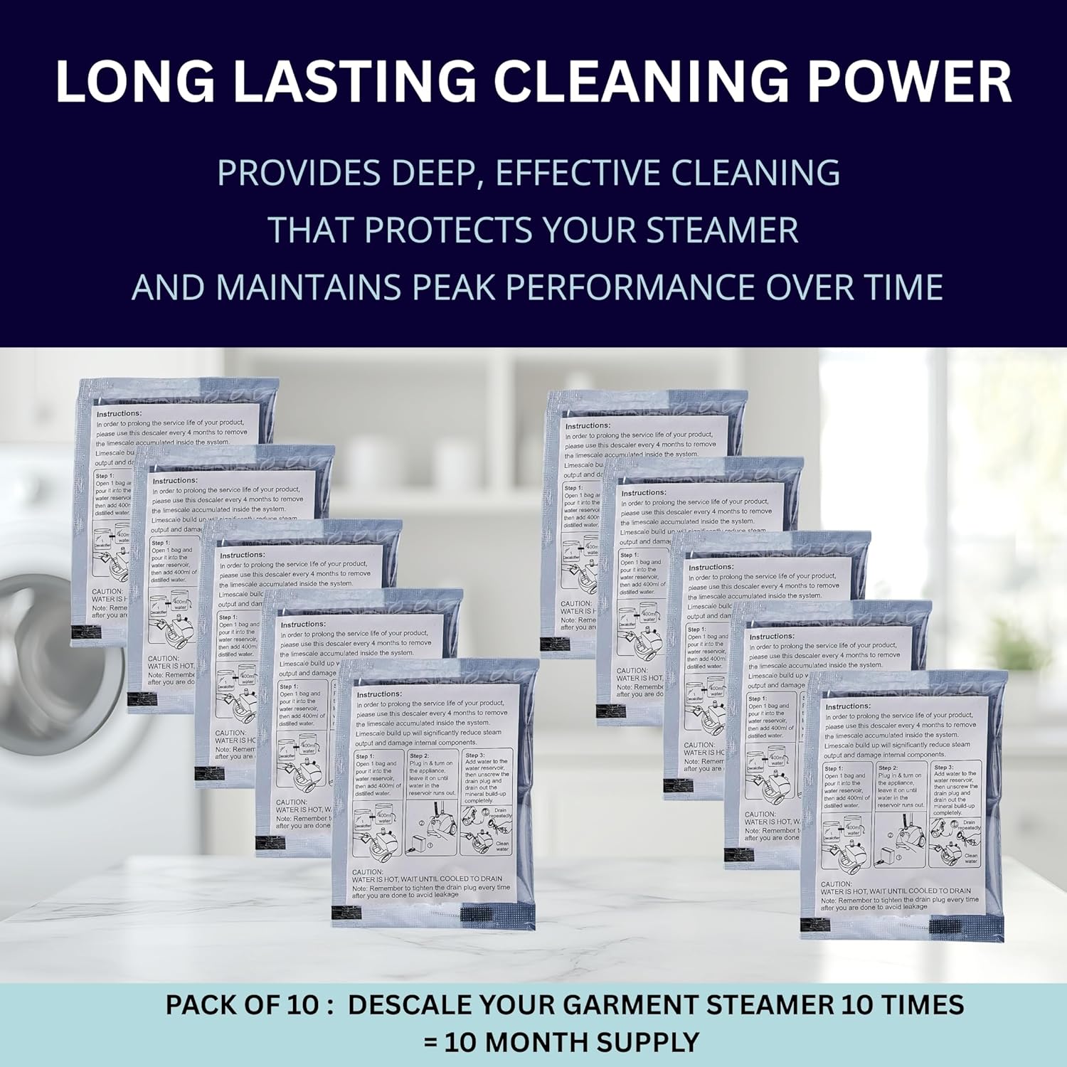 Garment Steamer Descaling Solution Decalcifier Packets for Mineral Deposits and Build-up Removal, Maintenance for Clothes, Works with all Garment Steamer Brands, Cleans Build Up, 10 packs