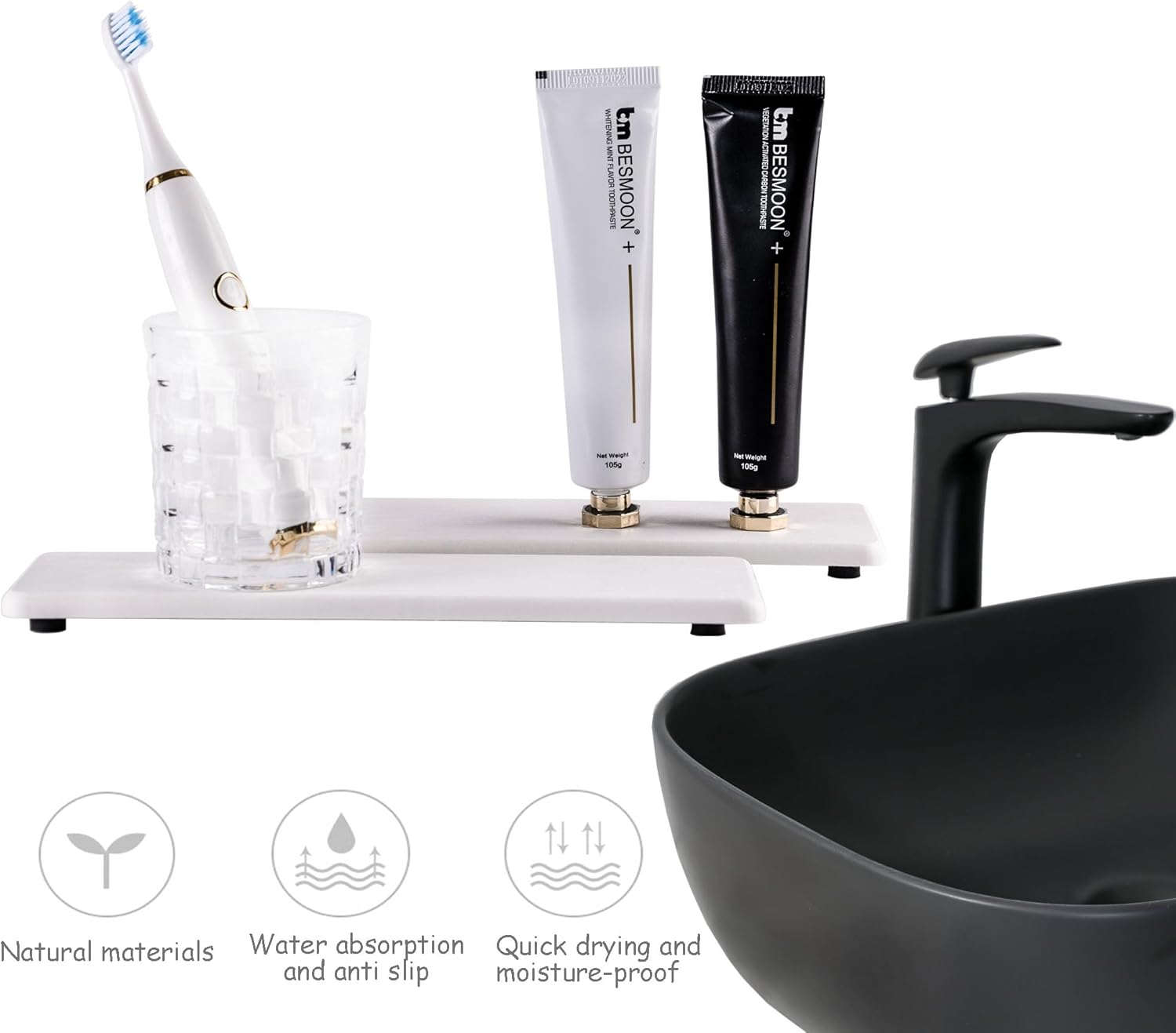 - Perfect Design Created for the Modern Home, to make life clean, comfortable and orderly. Made from natural Diatom mud and plant fiber, small holes within diatomite enable it have amazing water absorption. They could absorb water and gets dry in a few minutes. It makes the Bathroom Counter top more dry and tidy.