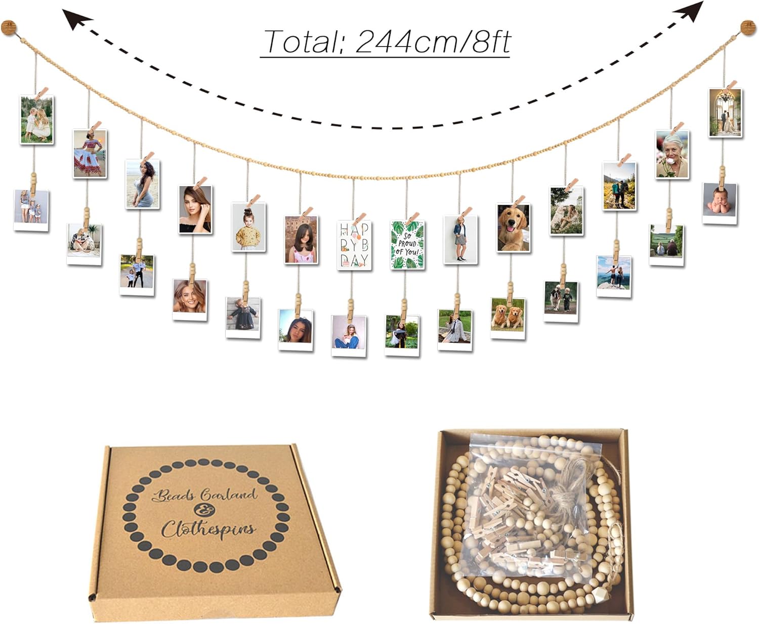 8 Feet Wooden Beads Garland with Clothespins Picture Cards Holder - Country Farmhouse Christmas Nursery Boho Holiday Decorations with Clips