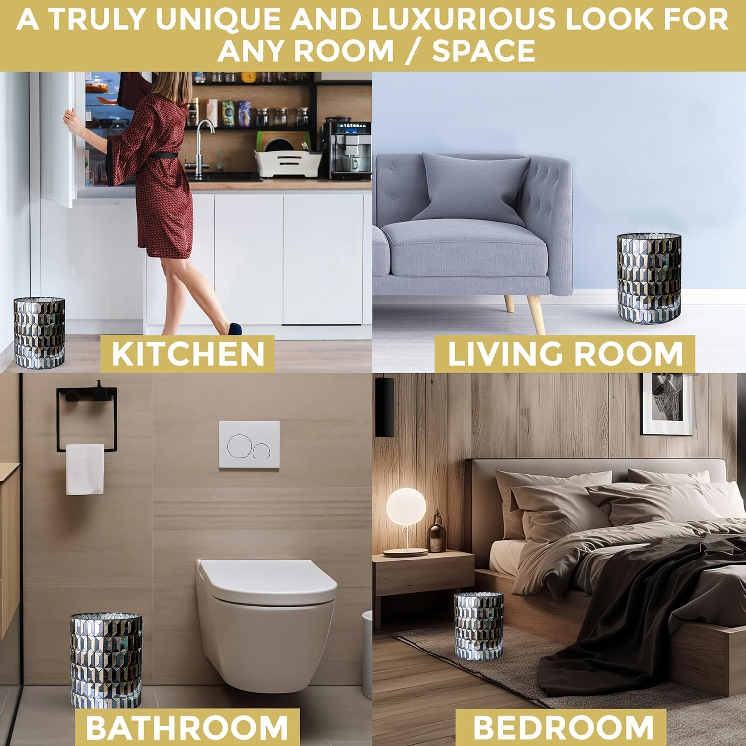 - Versatile Mosaic Glass Decor - Add a touch of glamour to any room with this small Trash Can, enhancing the ambiance in bathrooms, bedrooms, offices, kitchens, living rooms, or any open area.