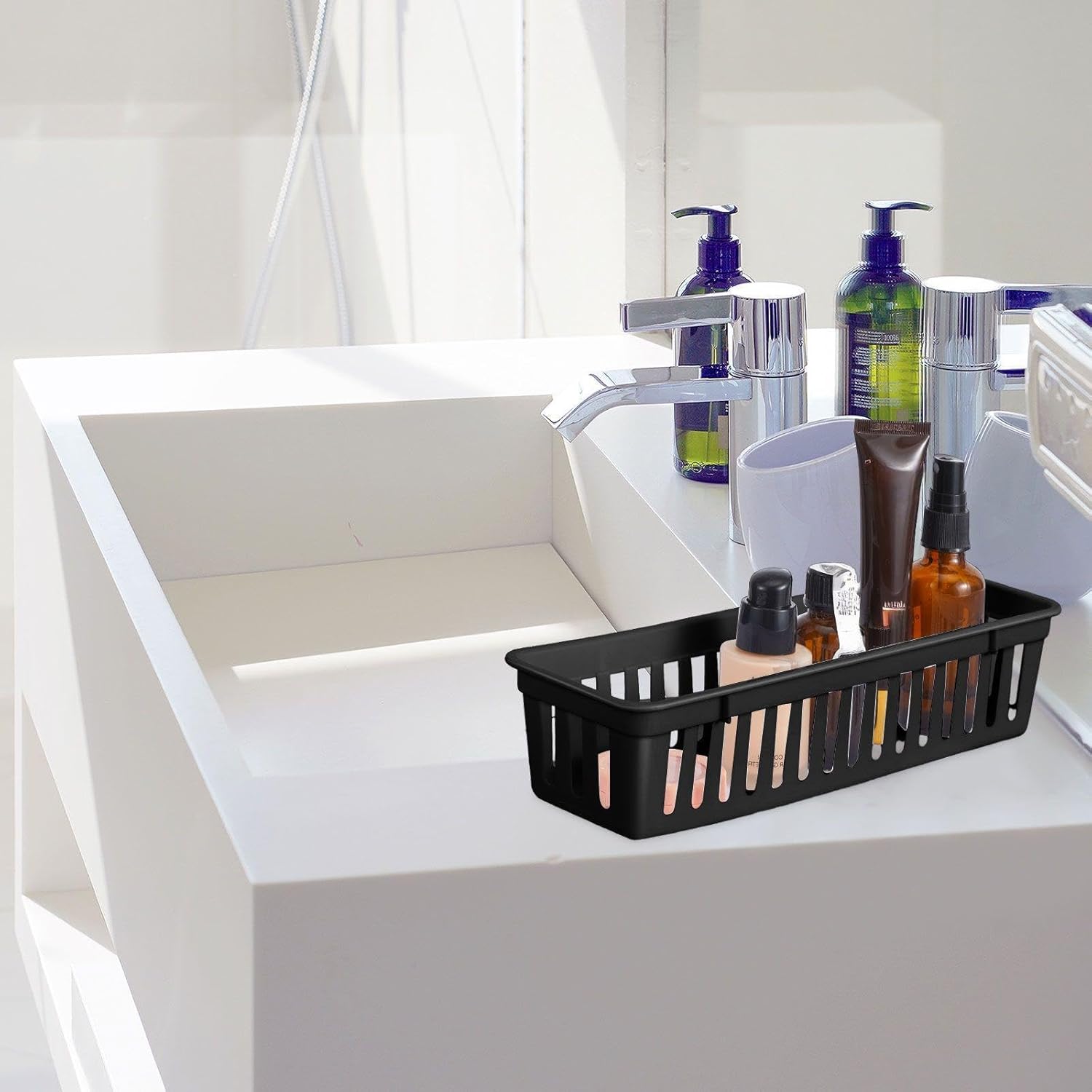 - Sleek Design Meets Nice Functionality: introducing our 12 pack of plastic storage baskets that meet most of your organizing needs; Crafted from durable PP plastic, they promise longevity combined with a stylish touch; The black color gives their sleek appearances and the dimension of about 10.25 x 3.25 x 2.5 inches/ 26 x 8 x 6 cm makes them the ideal organizer for those narrow spaces that are hard to utilize