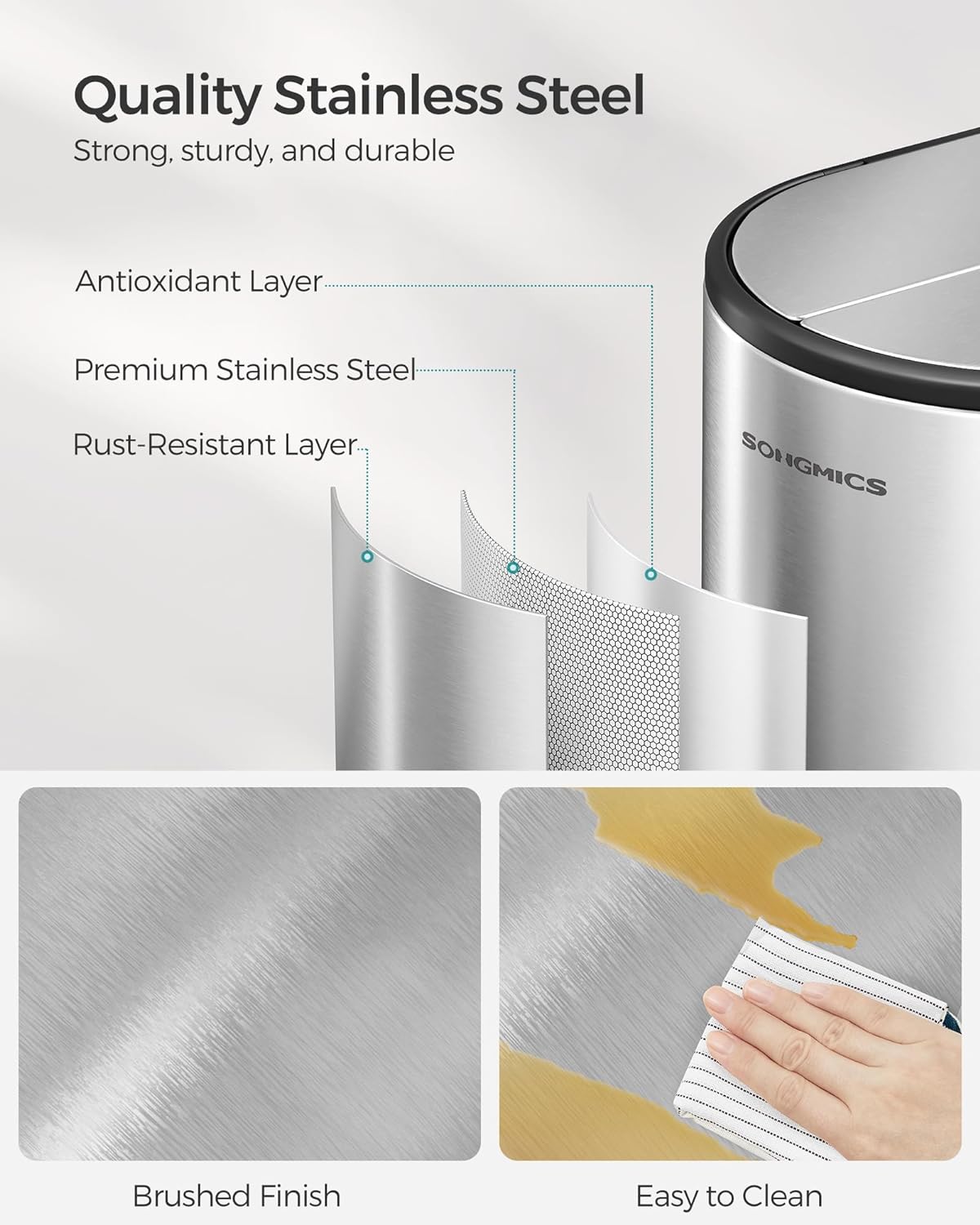 - [Soft Close] This garbage can promote a peaceful kitchen environment with its stainless steel lid that closes silently, eliminating any loud noises or bangs