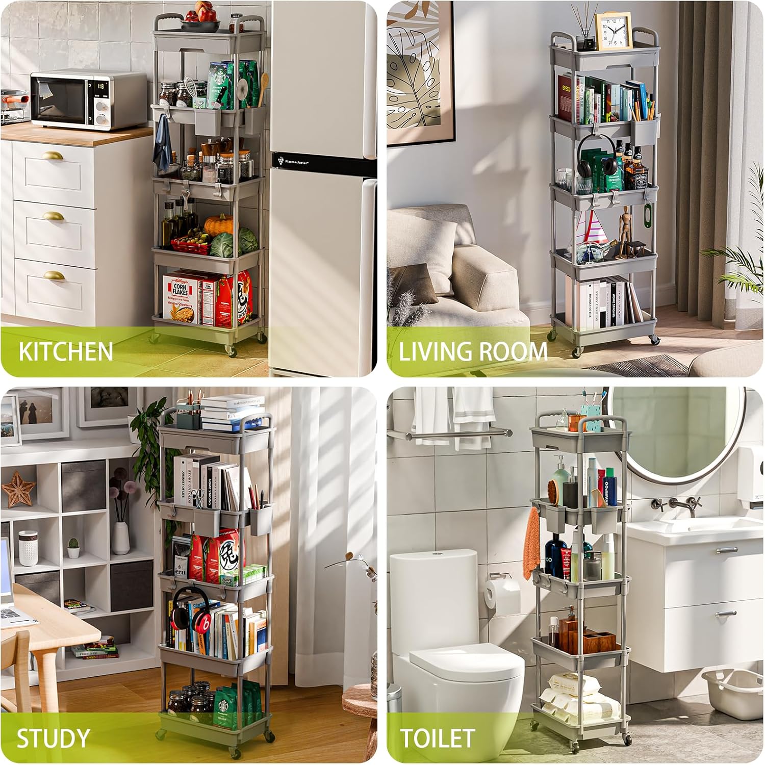 5 Tier Rolling Cart Organizer,Bathroom Cart Organizers with Wheels Laundry Room Organization Mobile Shelving Unit Utility Cart Storage Shelves Multi-Functional for Office, Home(Grey)