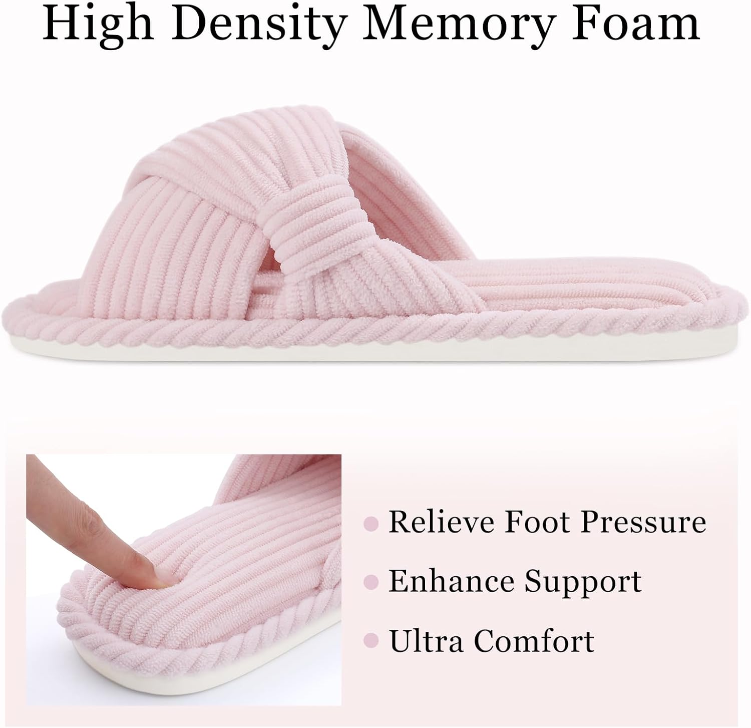 Evshine Summer House Slippers for Women Corduroy Cross Bow Indoor Slippers Open Toe Slip On Bedroom Shoes with Memory Foam