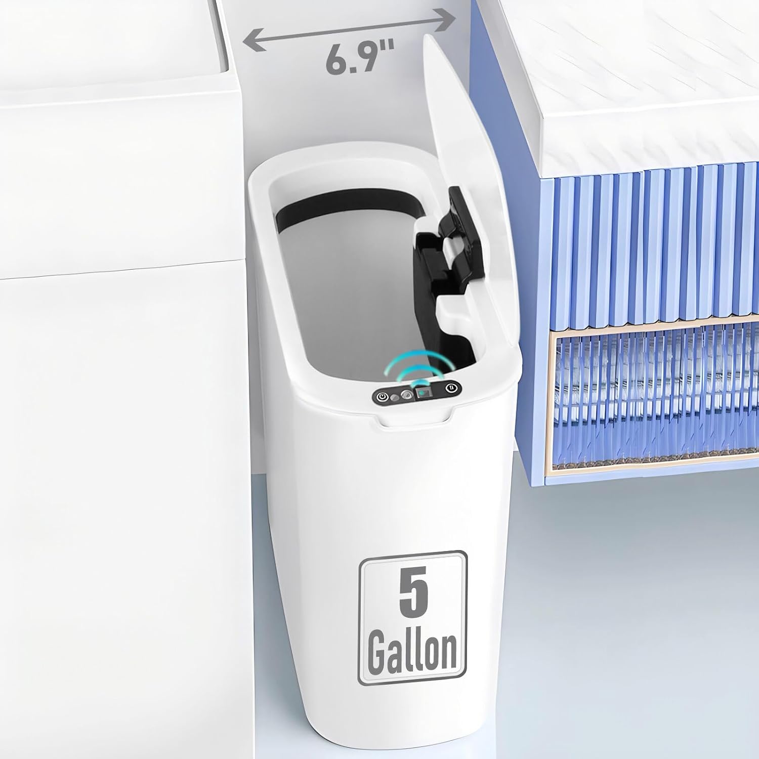 TIPGO 5 Gallon Motion Senor Bathroom Trash Can with Lid, Automatic Garbage Can Touchless, Smart Plastic Waste Basket for Narrow Spaces, Bathroom, Office, Bedroom, Living Room (White)