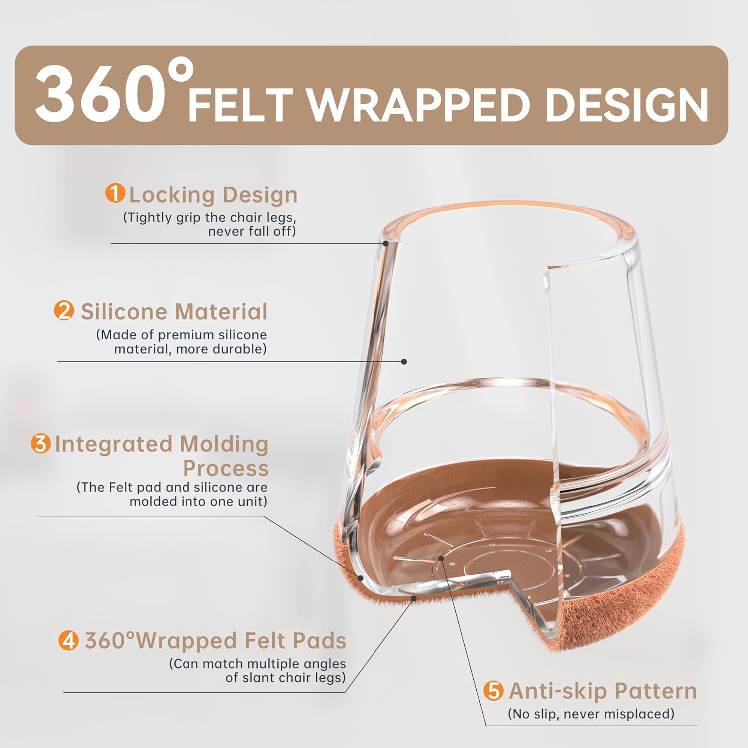 • ✅【Latest Upgrade】Compared with most of the traditional 1mm furniture pads on the market, our chair leg floor protectors are made of 2mm thick silicone, which will never be damaged, durable. The chair leg protectors will not change color when stretched. Inside of the inner sleeves are particles with anti-slip, which will firmly fix the chair and never make the covers fall off. Felt pads at the bottom make your furniture move silently and smoothly along floors without leaving marks and noise.