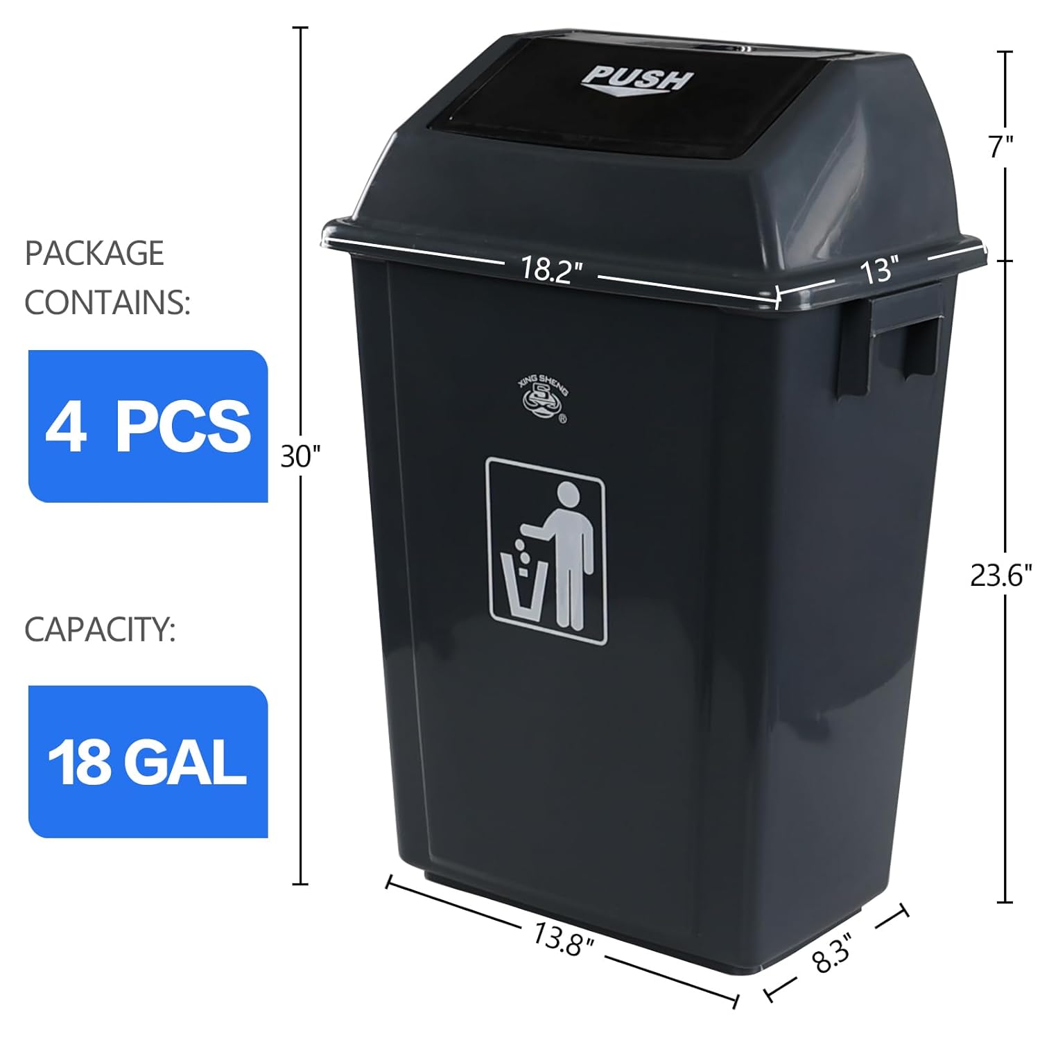 18 Gallon Plastic Trash Can with Swing Lid, 4-Pack Large Kitchen Swing-Top Garbage Can, Grey