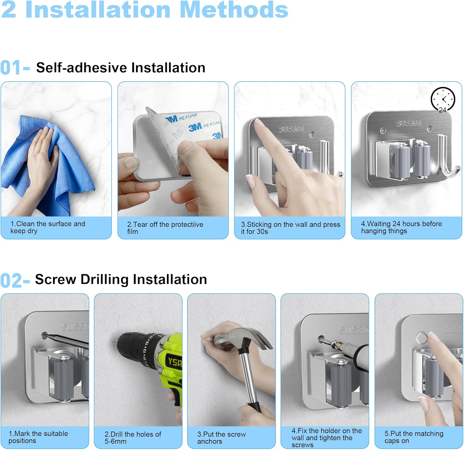 - Dual-Option Installation: Choose the convenience of 3M self-adhesive for damage-free mounting or opt for screw drilling for an even more robust hold—either way, installing this broom hanger wall mount is a breeze