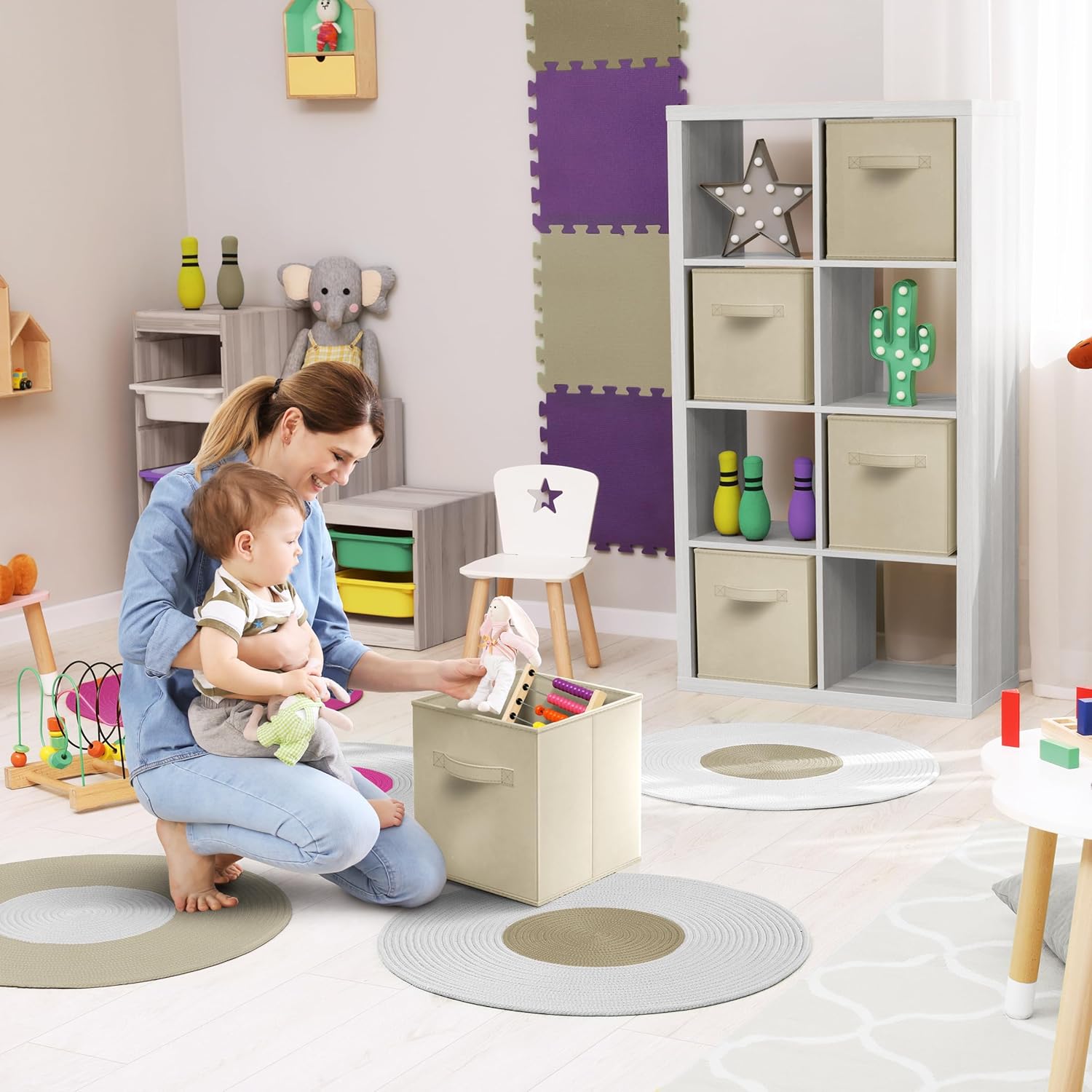 - Cubby Storage Bins Versatile Use: Use the Sorbus cube storage bins in the kid's room, toy storage, family room, laundry area, closet, storage room, etc - Sit Cube Organizer Bins on the floor, in the closet, bookcase, desk, shelving area, and cubbies