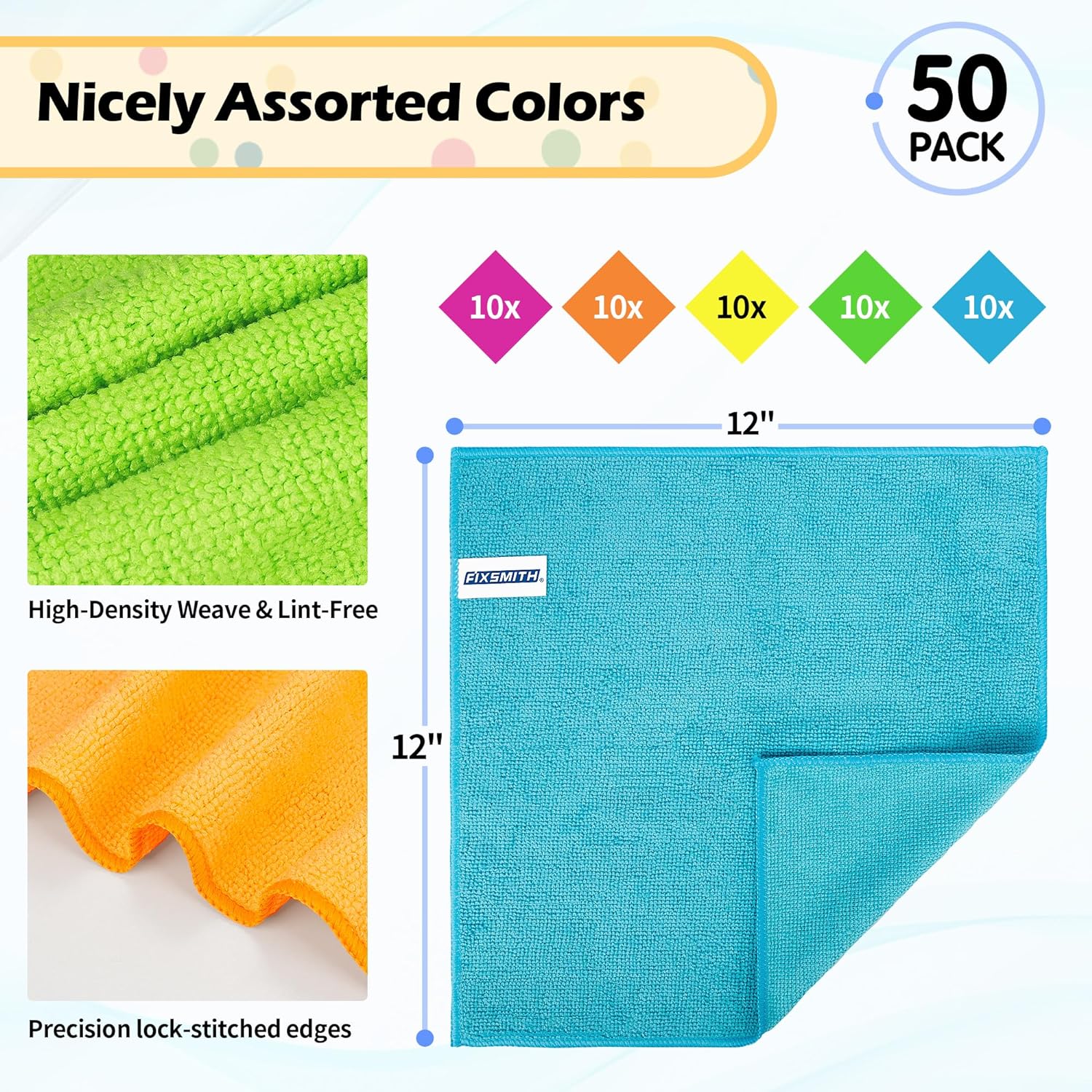 FIXSMITH Microfiber Cleaning Cloth, 50 Pack Cleaning Rags, Cleaning Towels for Housekeeping, Kitchen, Car, Lint-Free, Reusable Shop Towels with 5 Colors (Green/Blue/Yellow/Orange/Pink), 12"X12"