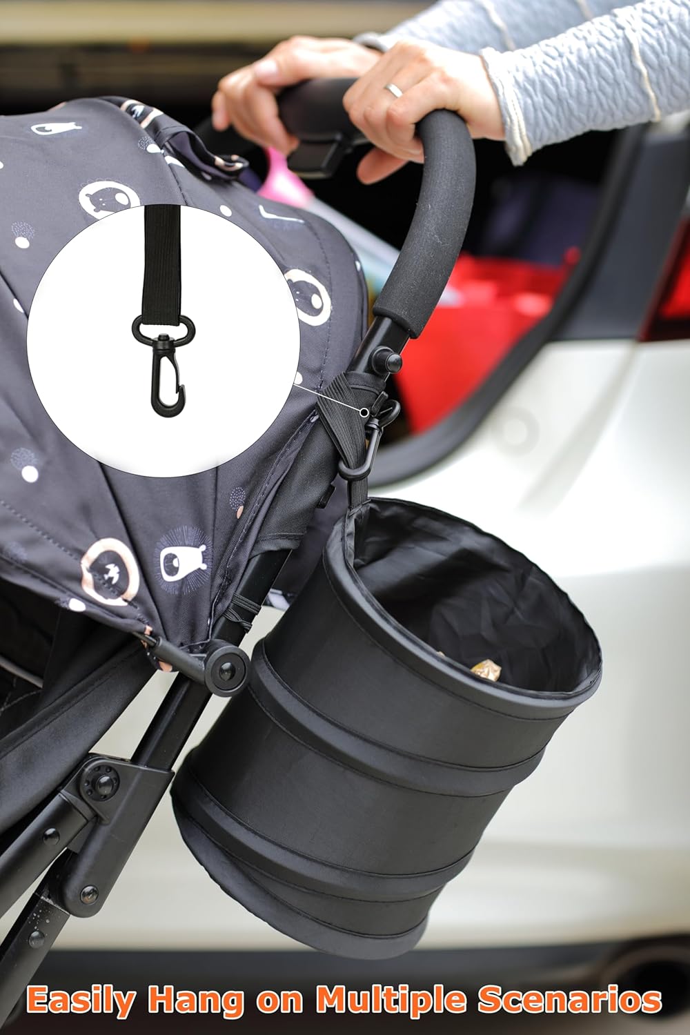 - KEEP YOUR CAR CLEAN AND TIDY – It is supposed to place a plastic bag inside the car trash bin before you use it. With this large capacity car trash can, all kinds of car garbage can be thrown in, no more loose items rolling around on the floor or taking up seat space, portable for travelling and camping.