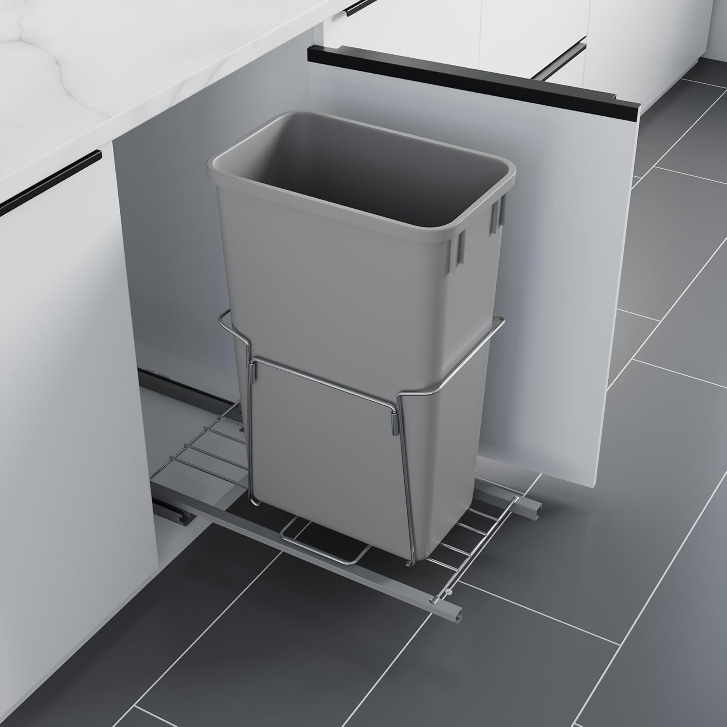 - EASY TO INSTALL: Easily mount the pullout sliders to the inside bottom of the cabinet, slip the fully assembled wastebasket pullout into the sliders and attach the front of wastebasket pullout to the cabinet door. All hardware and instructions are included.