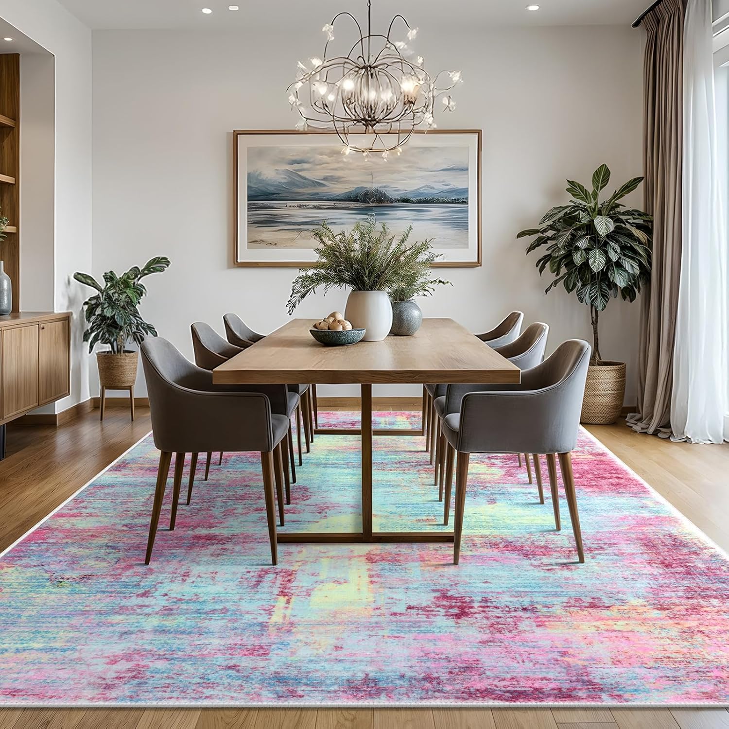 IOHOUZE Abstract Area Rugs 8x10 Ft Washable Large Rugs for Living Room, Non Slip Dining Room Rug, Printed Faux Wool Rugs for Bedroom, Floor Carpet for Office Nursery Playroom, Pink Teal