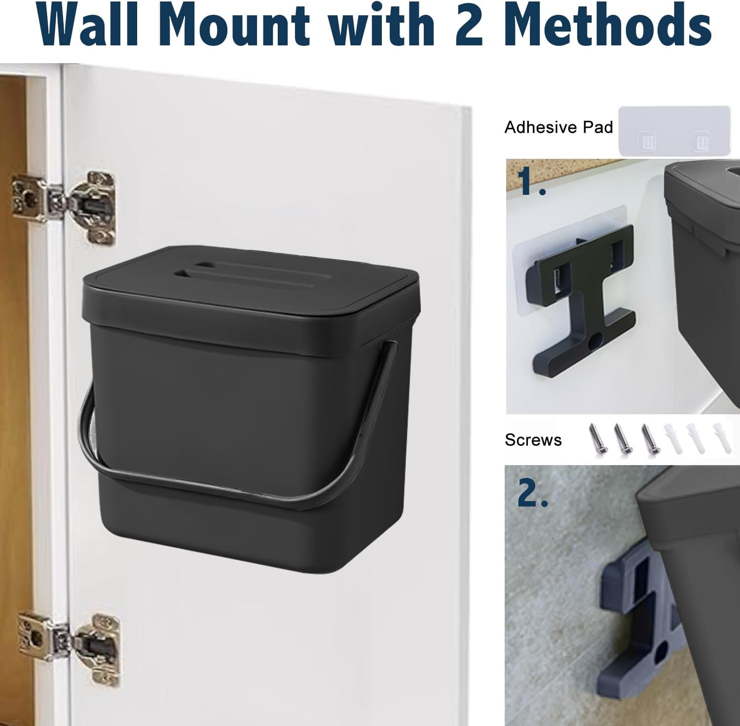 - Wall Mount/Under Sink/Hanging Trash Bin: The compost bucket can be easily hung on kitchen cabinet doors, pantry doors. (The thickness of the door should be less than 0.86 inch) Moreover, this small plastic trash bin also be wall-mounted to under sinks, cupboard, kitchen wall with adhesive pad or screws.