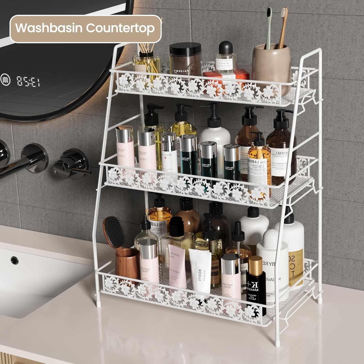 - iBedmazie 3-Tier Storage Racks Countertop Organizer,Large size Counter Spice Racks for Bathroom/Kitchen/Sink/Bedroom/Living room/Office/Coffee Station/Plant Rack with Two Metal Baskets