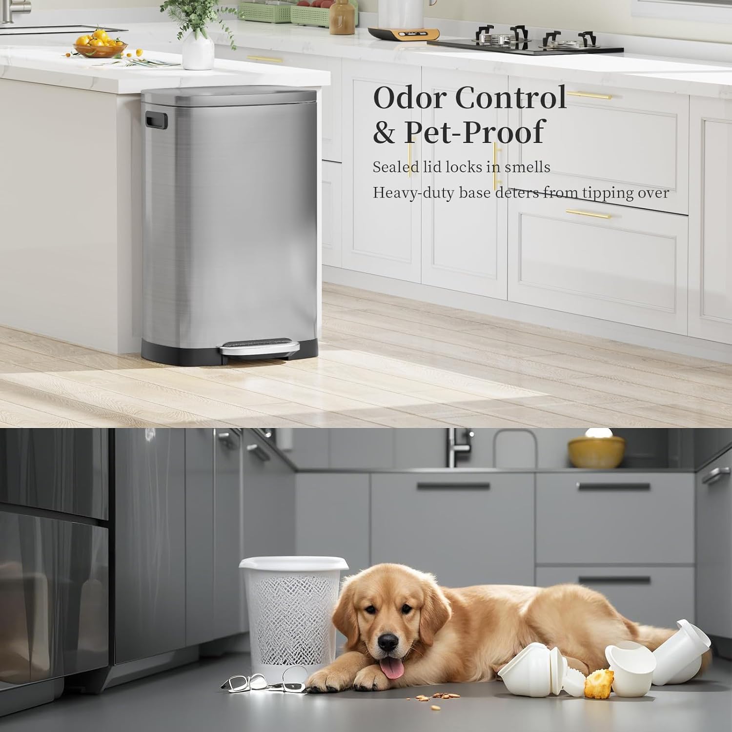 13 Gallon Trash Can with Lid, 50L Fingerprint Proof Stainless Steel Kitchen Trash Can with Removable Inner Bucket and Lid Soft Close, Pedal Rubbish Bin for Home Office(Silver)