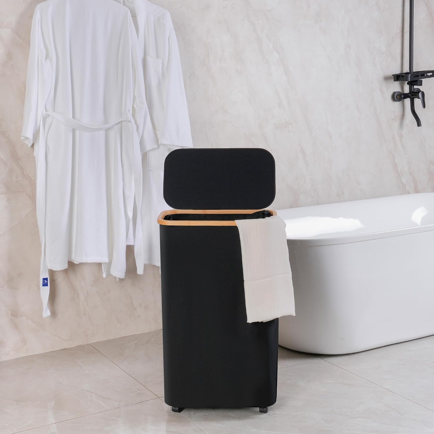 - 【Bamboo Handles and Removable Liner】The slender laundry basket comes with sturdy bamboo handles for easy carrying and a removable inner bag for convenient laundry sorting and machine washing. The bamboo handles offer a natural, eco-friendly touch, while the liner simplifies the laundry process, keeping your space organized and clean.