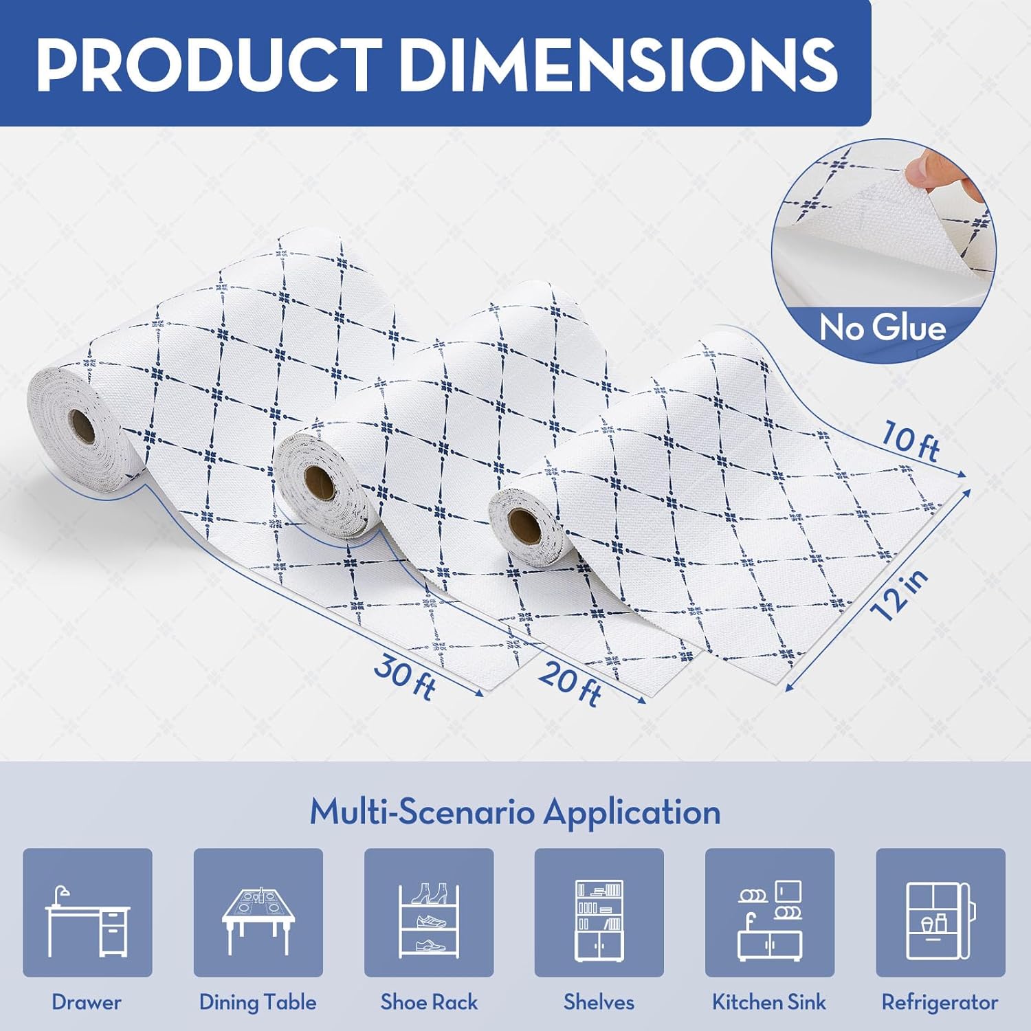 - 【Non-Adhesive】Kitchen Shelf Liner: Made of PVC composite material, which is glue-free and has enough grip, so glue is not required,don't worry about damaging the surface of the cabinet, avoiding the damage of the glue to the surface of the cabinet, drawer, table and shelf