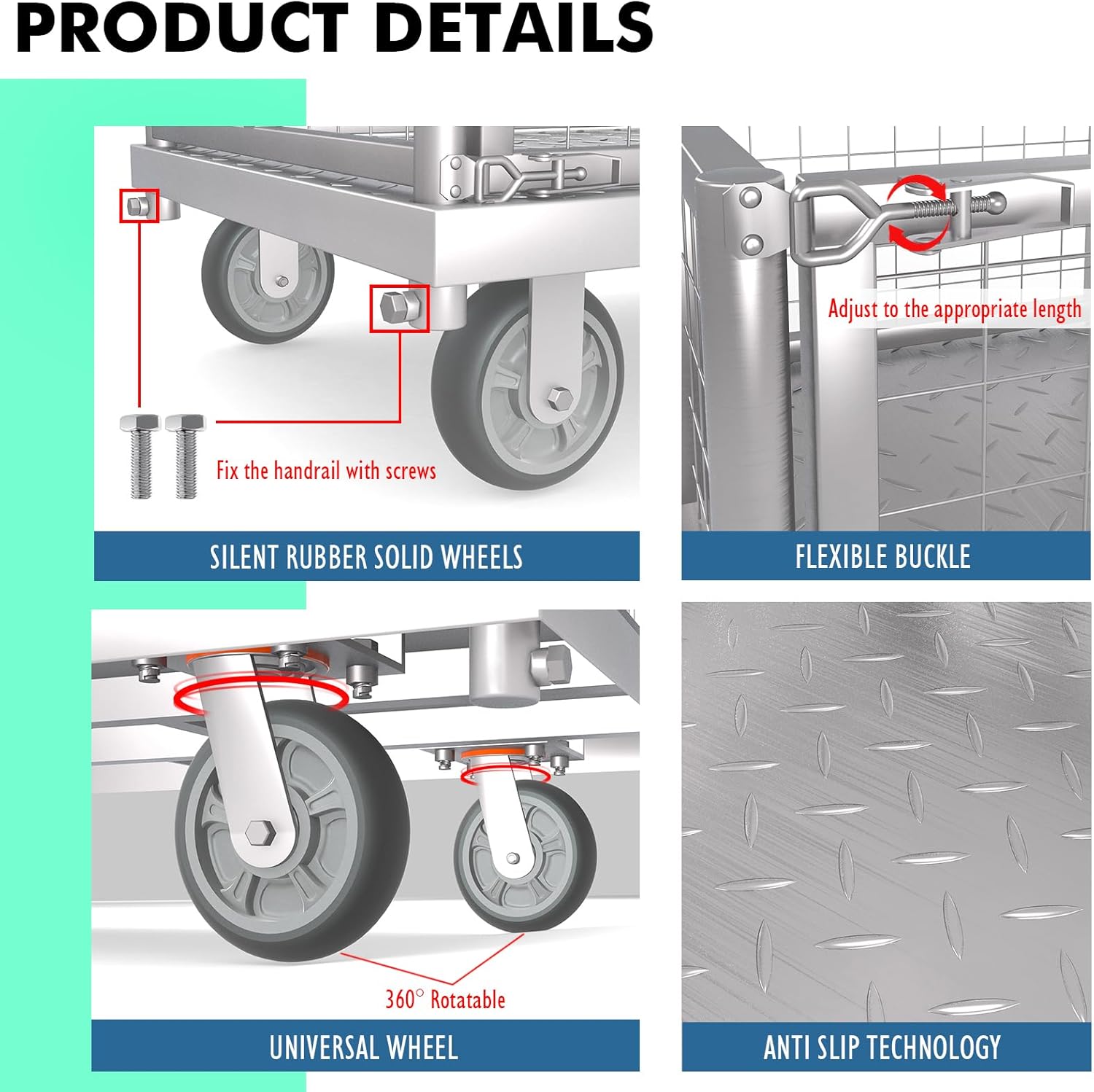 - 【Versatile Design】: 4-in-1 Muti-purpose design equipped with a cage to secure items during transport. The fences on both sides are detachable and can be changed according to different items. In order to enhance the stability of the handrails, we have adopted a plug-in design, making the connection between the cart panel and the handrails more stable