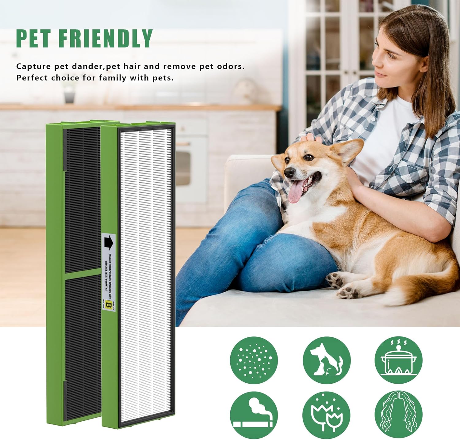 - 【Activated Carbon Pre-filter】The activated carbon pre-filter can absorb household odors such as cooking odors,pet odors,wildfire smoke,and VOCs.Besides,it also helps to protect the HEPA for longer time usage.
