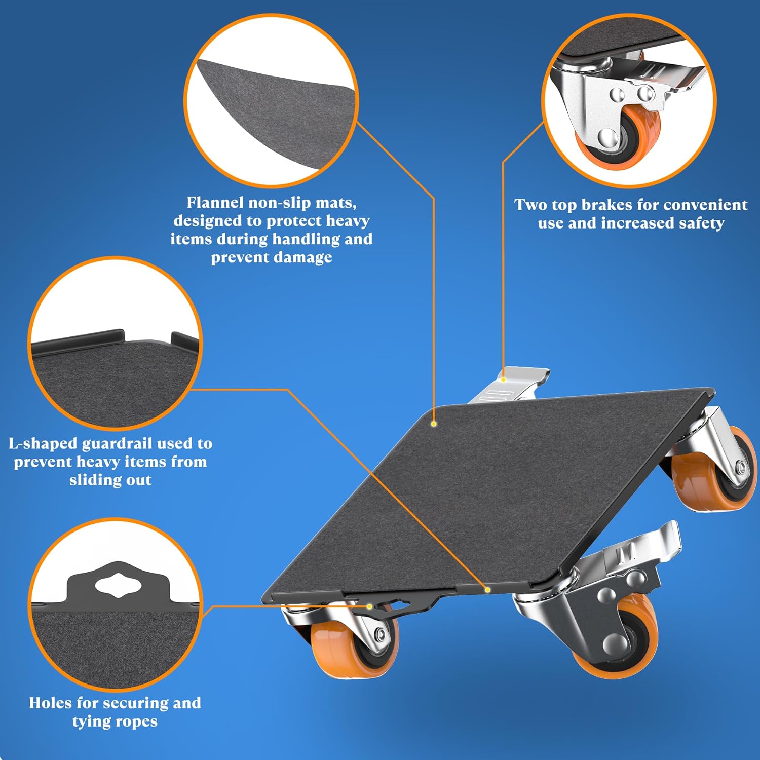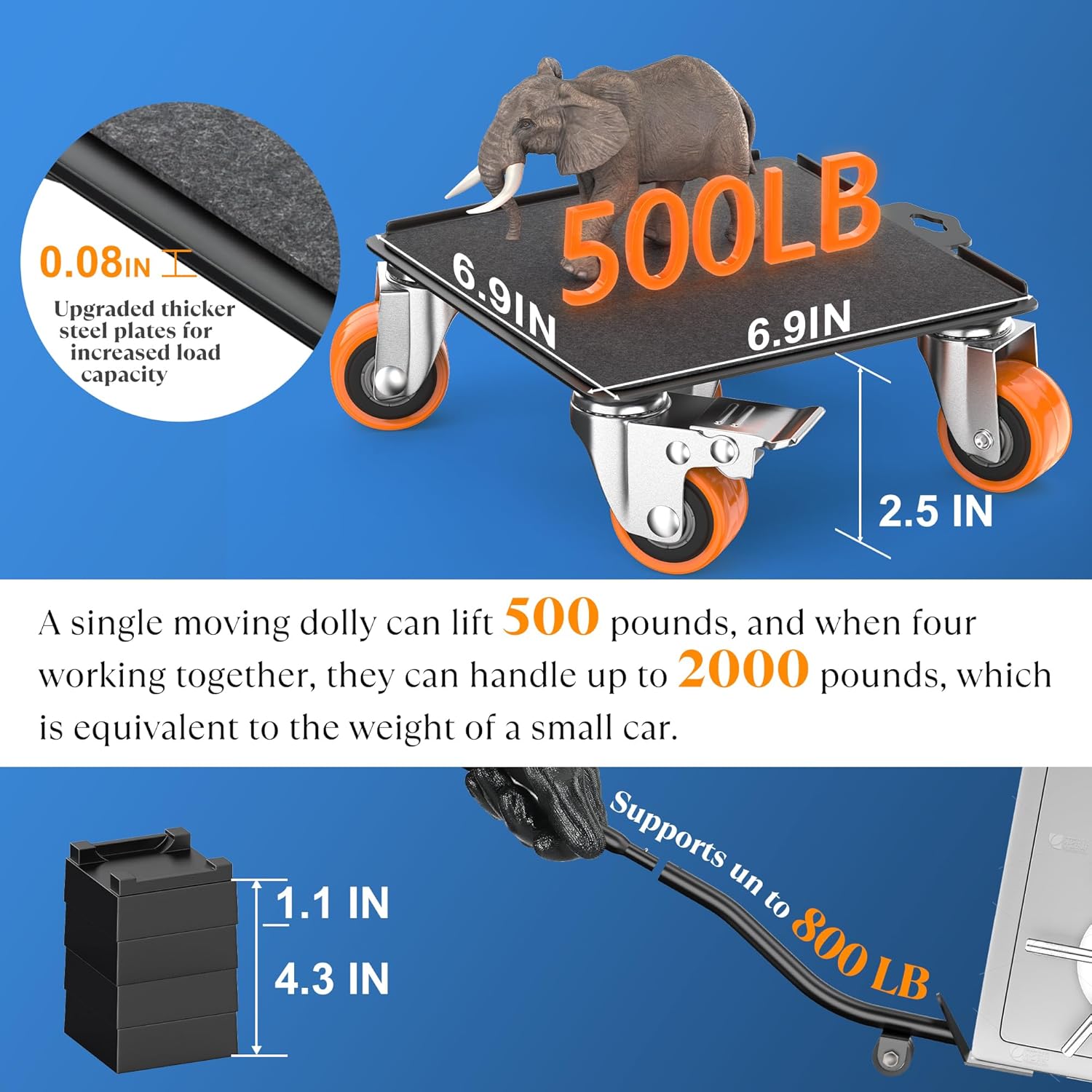 - COMPLETELY UPGRADED – The upgraded moving tool now features 5 wheels, a reinforced load-bearing steel plate, and enhanced weight limit. The wheels are made of soft rubber material to effectively protect your floors. A single moving dolly can lift 500 pounds, and when four working together, they can handle up to 2000 pounds, which is equivalent to the weight of a small car.