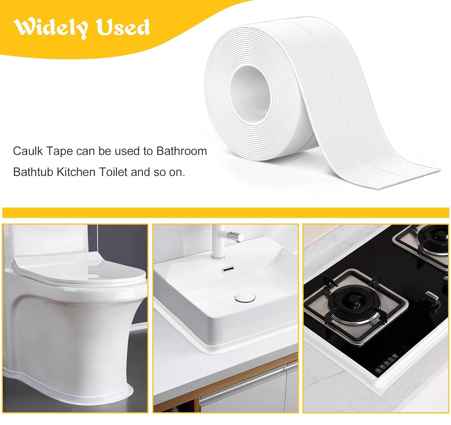 - ✅Wide Applications: Self-adhesive sealant tape is widely used for sealing joints in toilets, bathroom, kitchen, sinks, pools, bathtubs, gas stoves and walls. The shower seal strip can prevent them from blackening and keep your kitchen and bathroom clean and tidy.