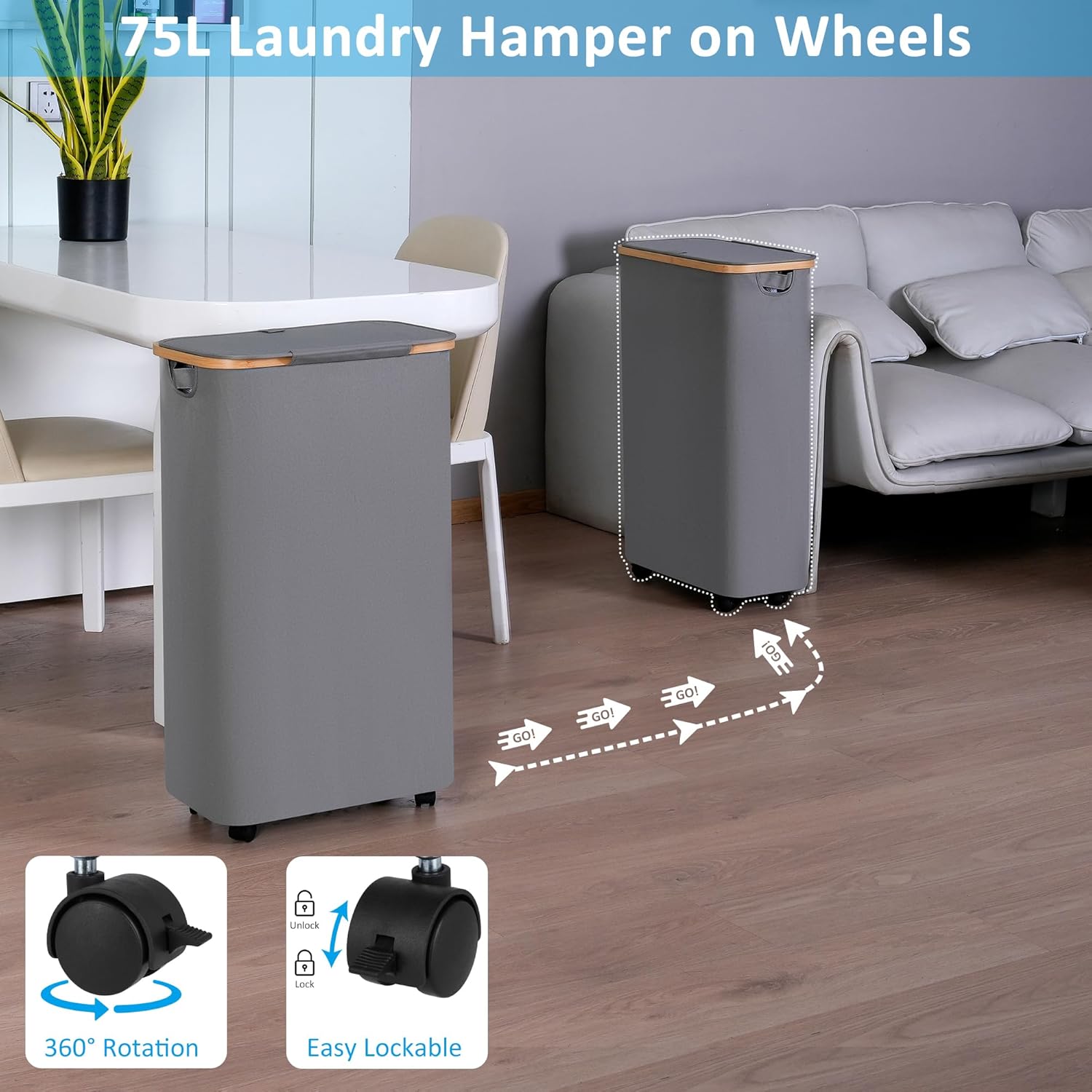 efluky Slim Laundry Basket with Wheels, Narrow Rolling Laundry Hamper with Lid and Removable Bag, Tall Aesthetic Dirty Clothes Hamper on Wheels for Laundry Room, Bedroom, Dorm and Bathroom, 75L Grey