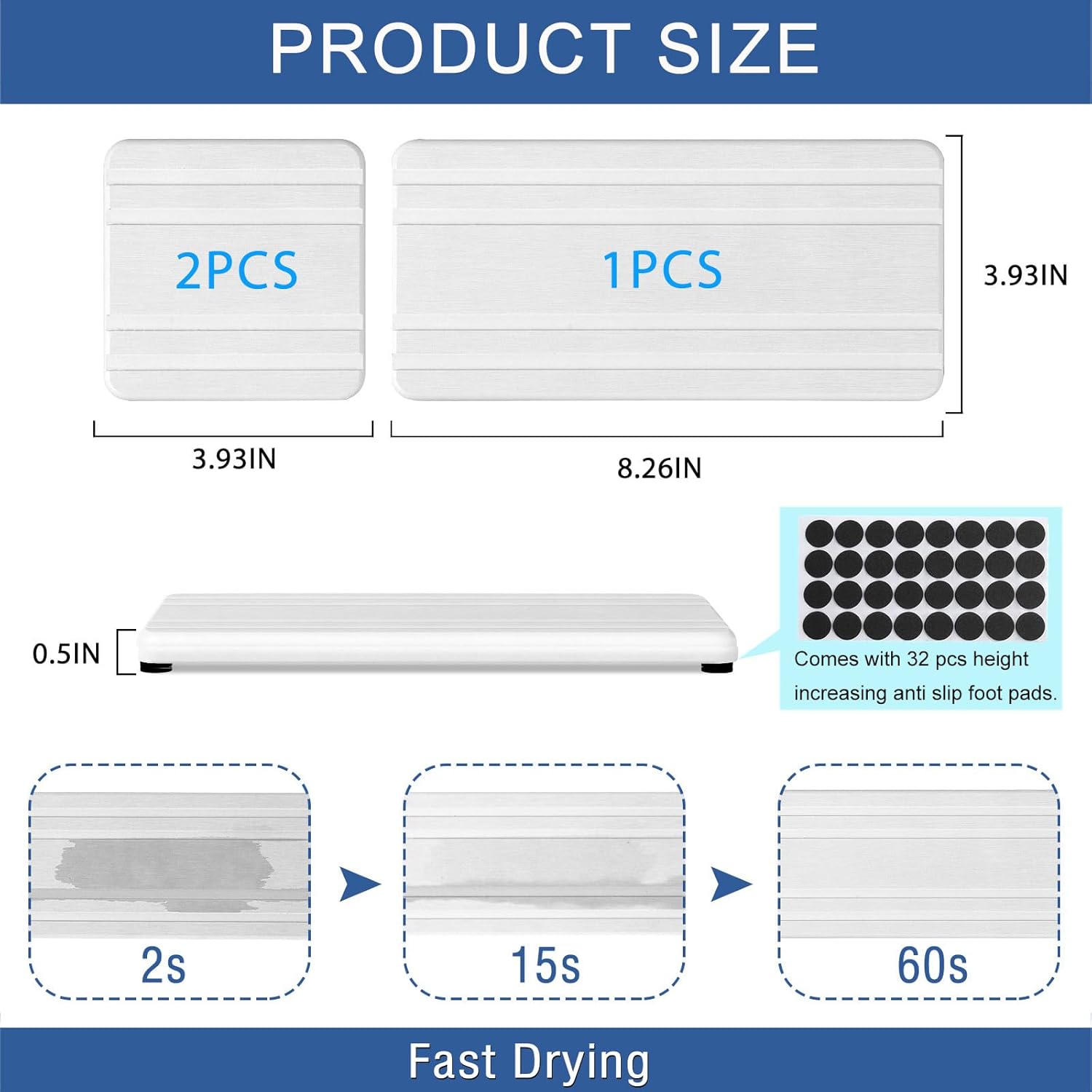 - More Anti Slip and Ventilated --- The silicone footpads boost the slip-resistance of absorbent stone coasters while keeping them out of the bathroom vanity. This design improves the contact surface between diatomaceous earth coasters and air, accelerates the evaporation of water, and extends the service life of the water absorbing stone tray for sink.