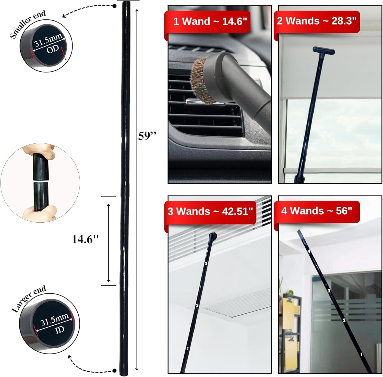 - Great tool to help cleaning high and low places: The length of the wand is 14.6", 4 pack can extend up to 59inch length. The extension wand attached to your vacuum can help you reach high up to get cobwebs