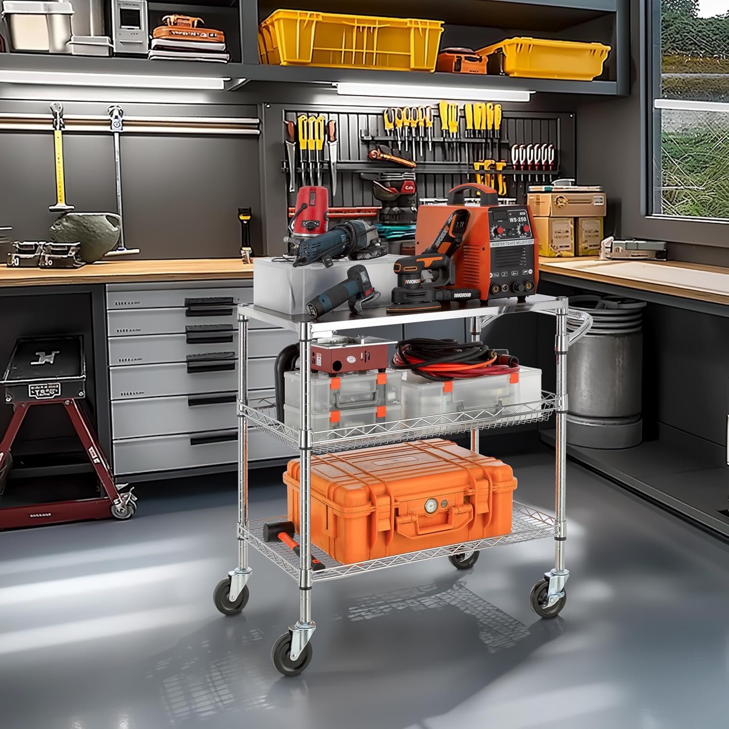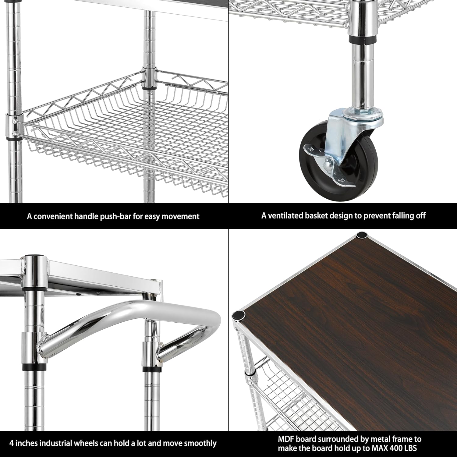 Finnhomy 3 Tier Heavy Duty Commercial Grade Utility Cart with Wood Top, Wire Rolling Cart with Wheels and Handle Bar, Kitchen Carts on Wheels, Metal Cart with 600 LBS Capacity, Chrome