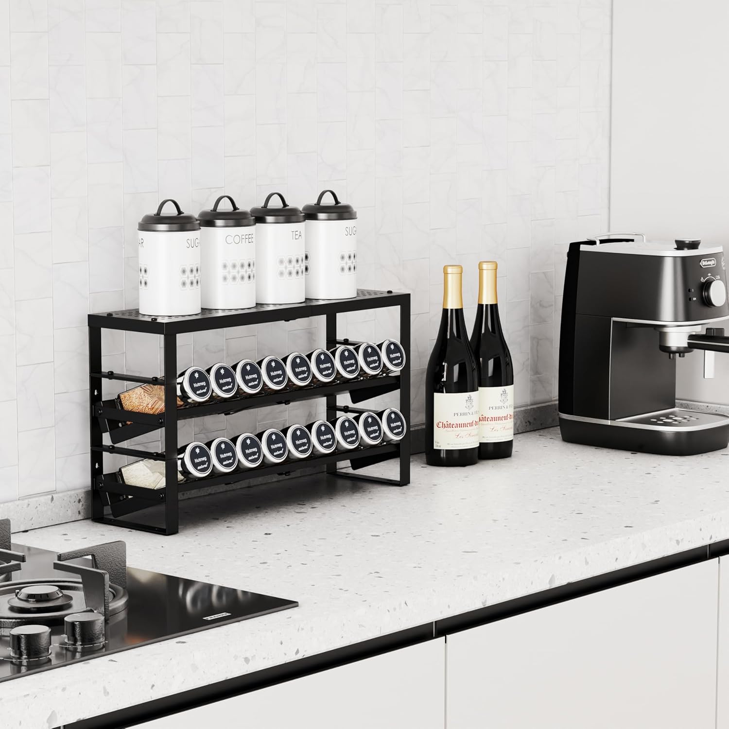 - ⭐【Sturdy Construction for Long-Lasting Use】Constructed from heavy-duty steel with a powder-coated finish, this spice rack is built to withstand the rigors of daily use. Whether loaded with your favorite spices or empty, it remains stable and secure.