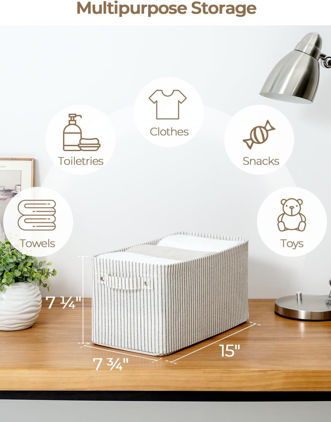 StorageWorks Narrow Storage Bins, Small Basket for Closet and Shelves, Rectangular Fabric Organizer with Handles, Toilet Paper Storage, Khaki and Beige Stripes, 2-Pack