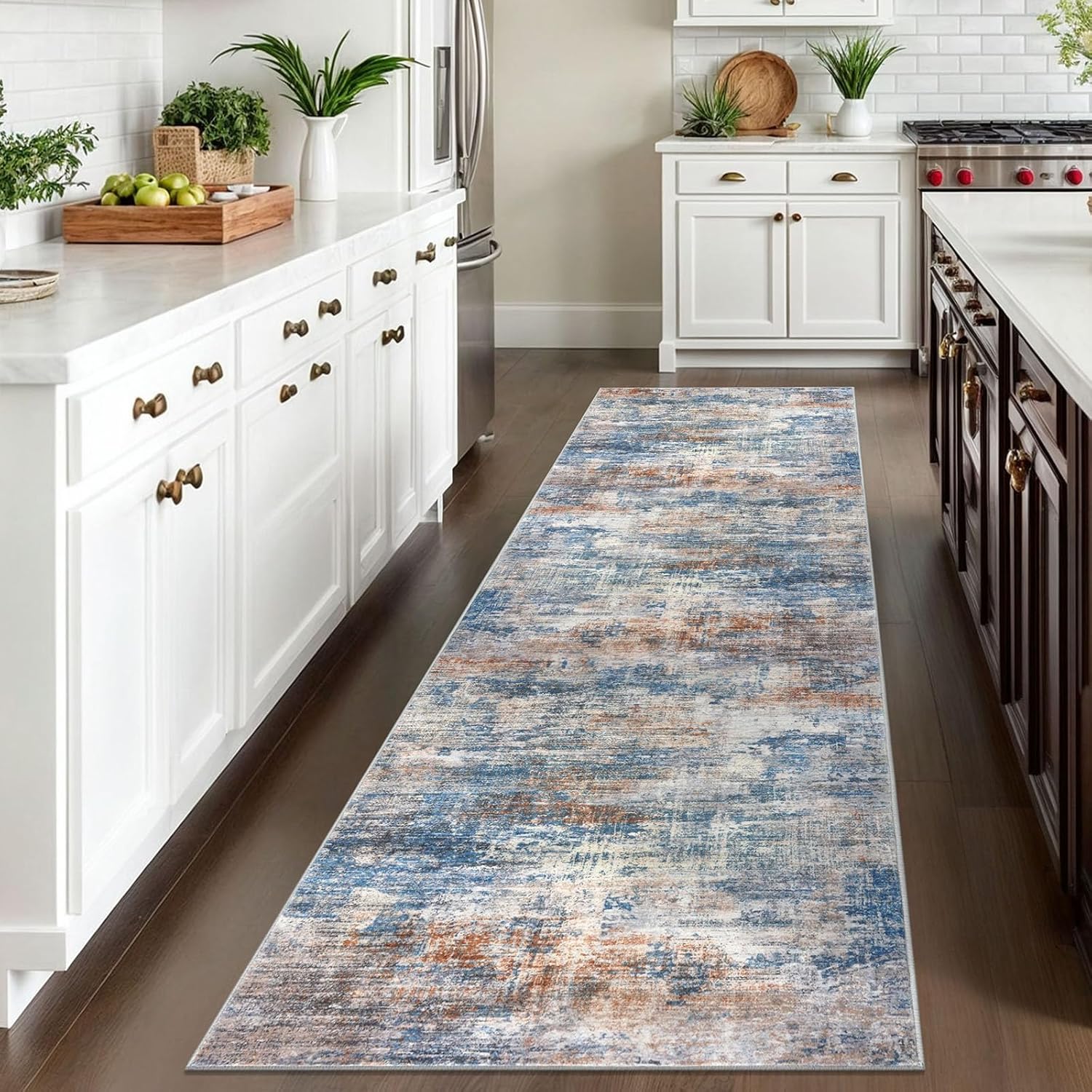 IOHOUZE Abstract Runner Rug 3x10 Ft Washable Runners for Hallways, Non Slip Kitchen Runner Printed Faux Wool Entryway Runner Indoor, Modern Abstract Floor Carpet for Hall Bedroom, Blue Rust
