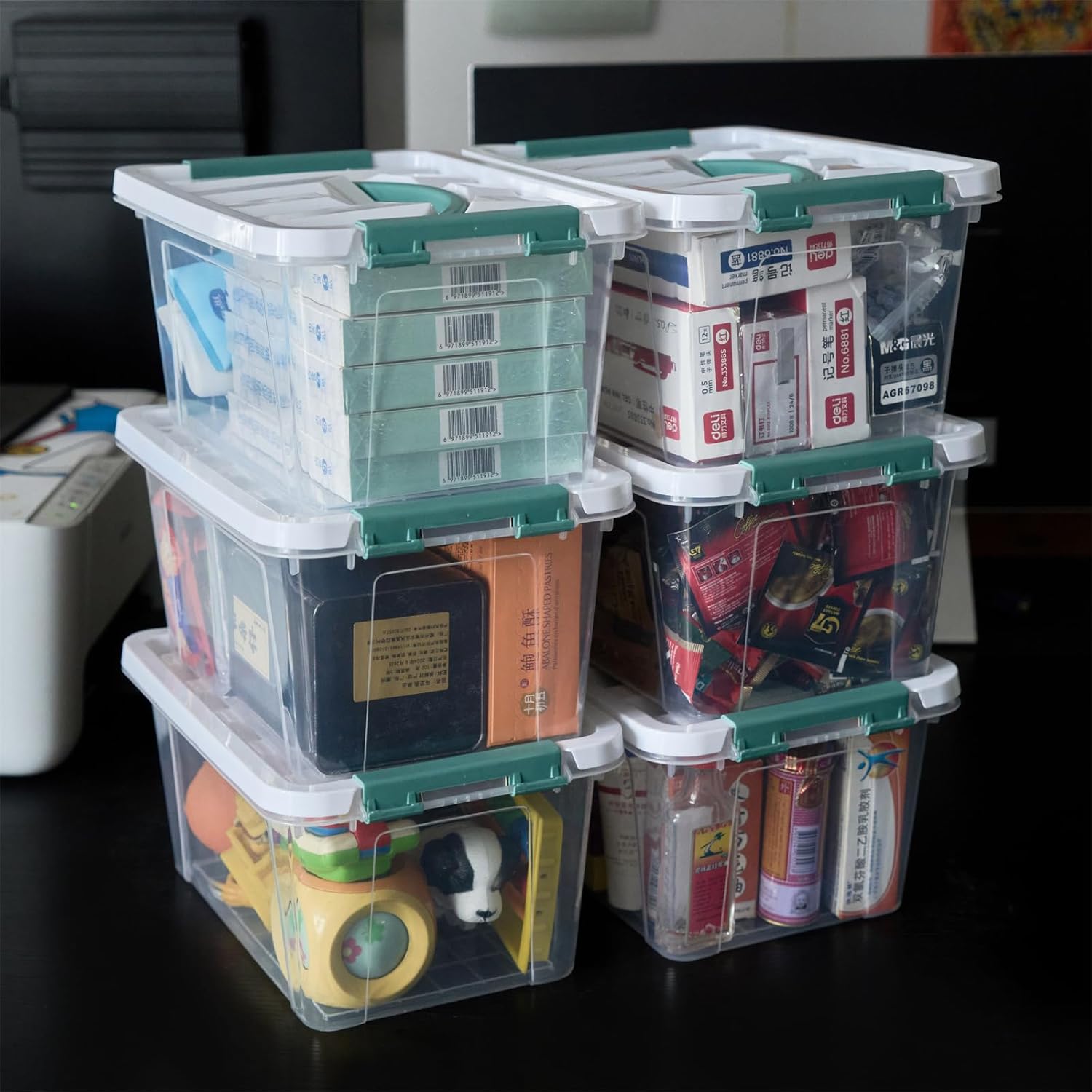 6 Quart Plastic Stackable Storage Latch Bins,Clear Latching Box with Handle and Lid,Pack of 6 (Green Handle)
