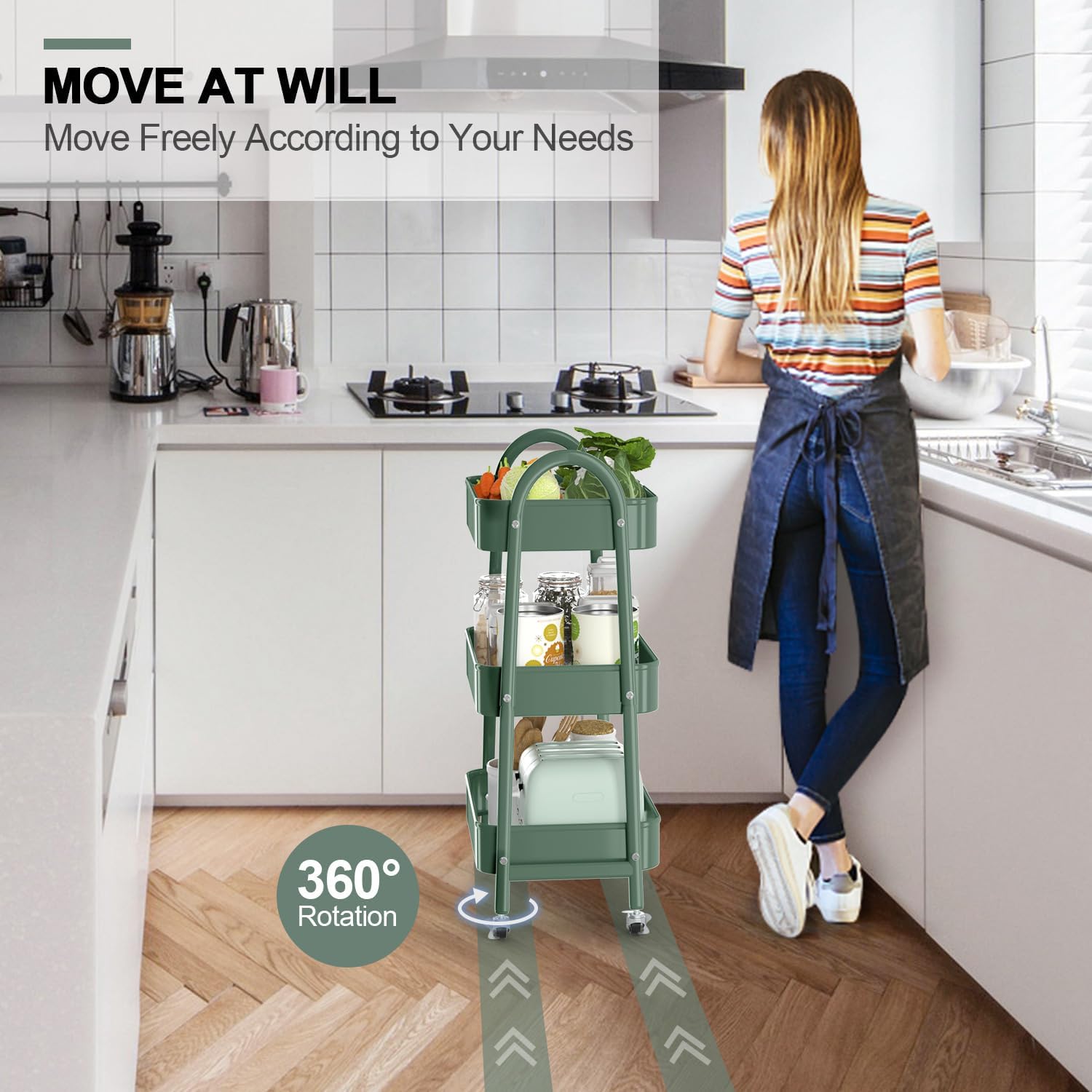 EAGMAK 3 Tier Utility Rolling Cart, Metal Storage Cart with Handle and Lockable Wheels, Multifunctional Storage Organizer Trolley with Mesh Baskets for Kitchen, Living Room, Office, Garage (Jungle)