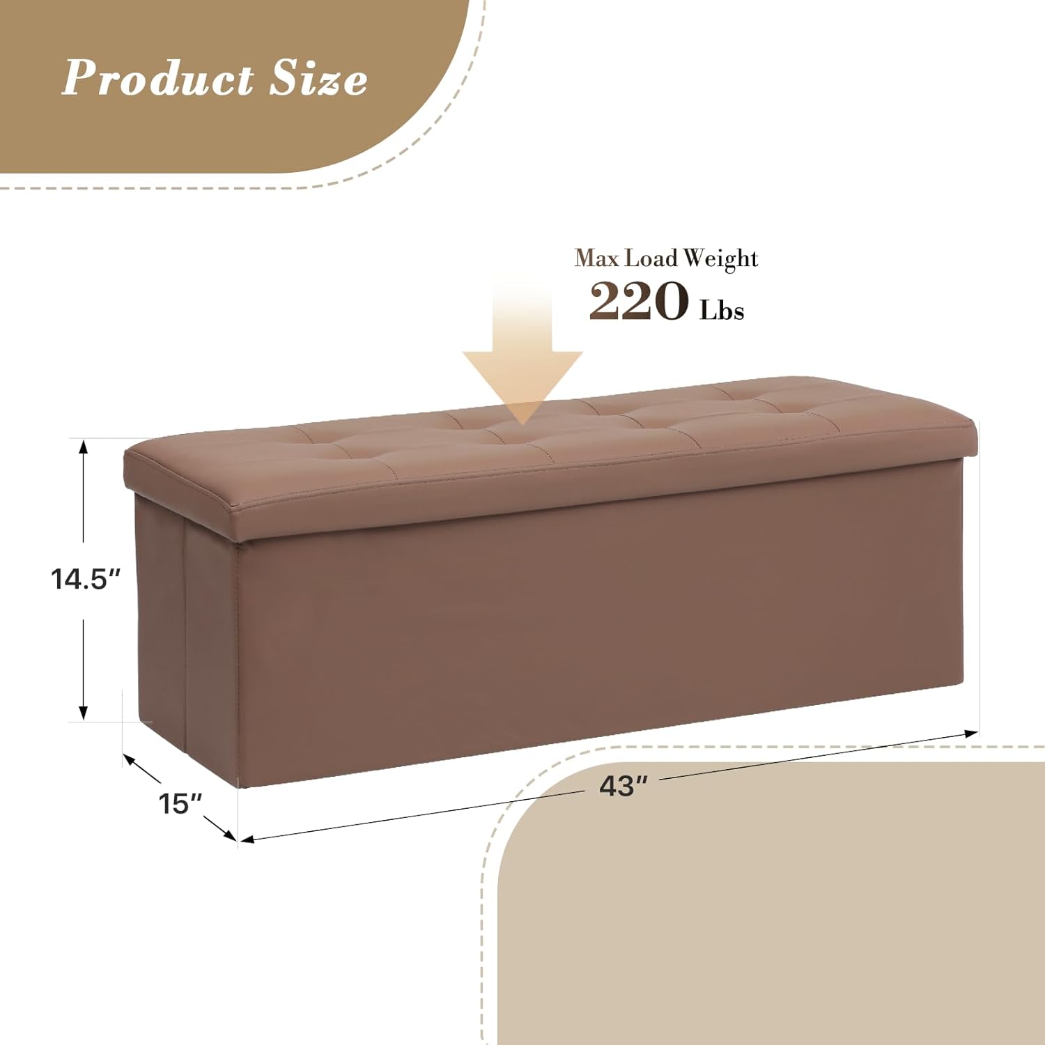 Athena Collection 43" Storage Ottoman Bench Folding Bench with 130L Hidden Storage, Large End of Bed Bench PU Leather Foot Rest Stool Chest with Flipping Lid for Living Room, Bedroom, Entryway, Brown