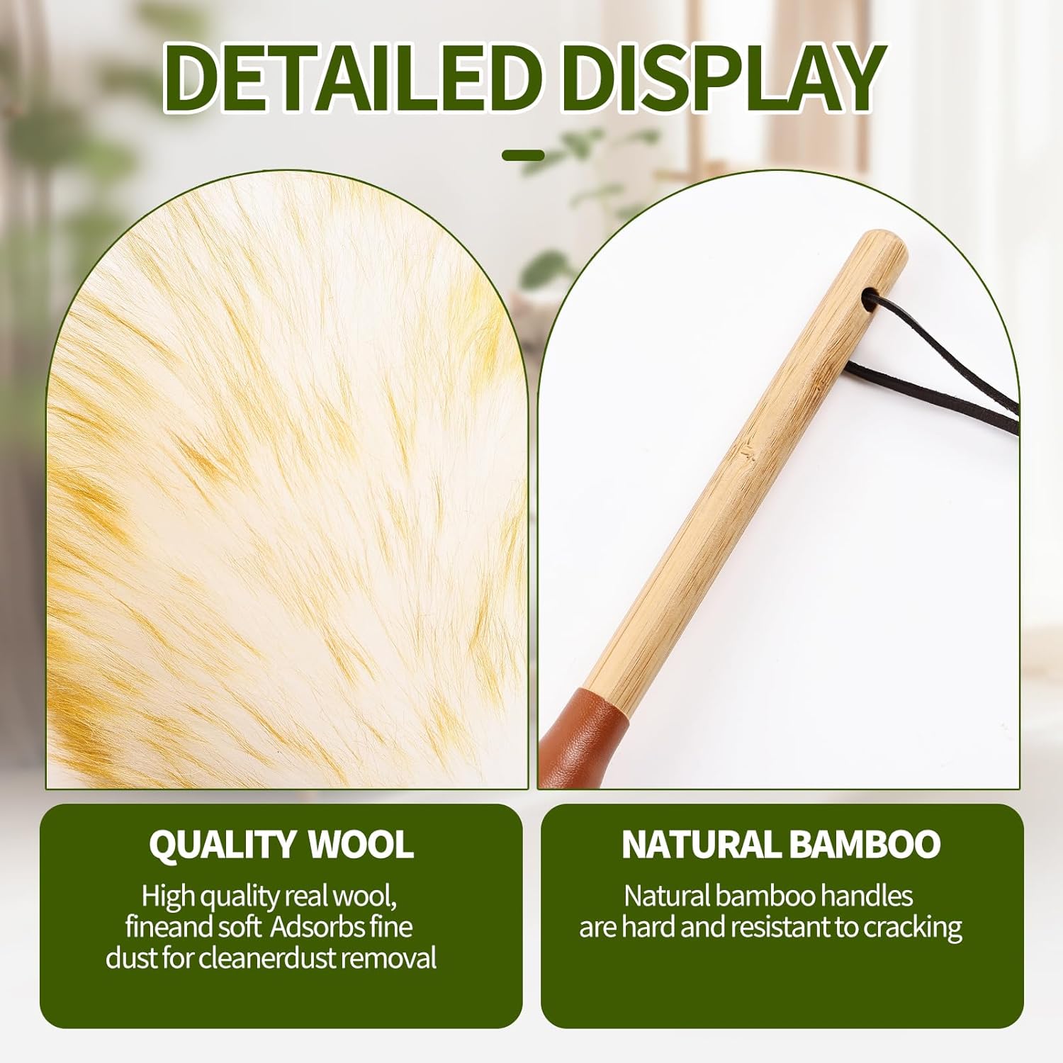 - Handle Design: Features a lightweight, 7-inch (18cm) sustainably sourced wooden handle, comfortably cleaning desktops, pianos, shelves, antiques, car interiors, electronic equipment dust, plants, on picture frames, and other places
