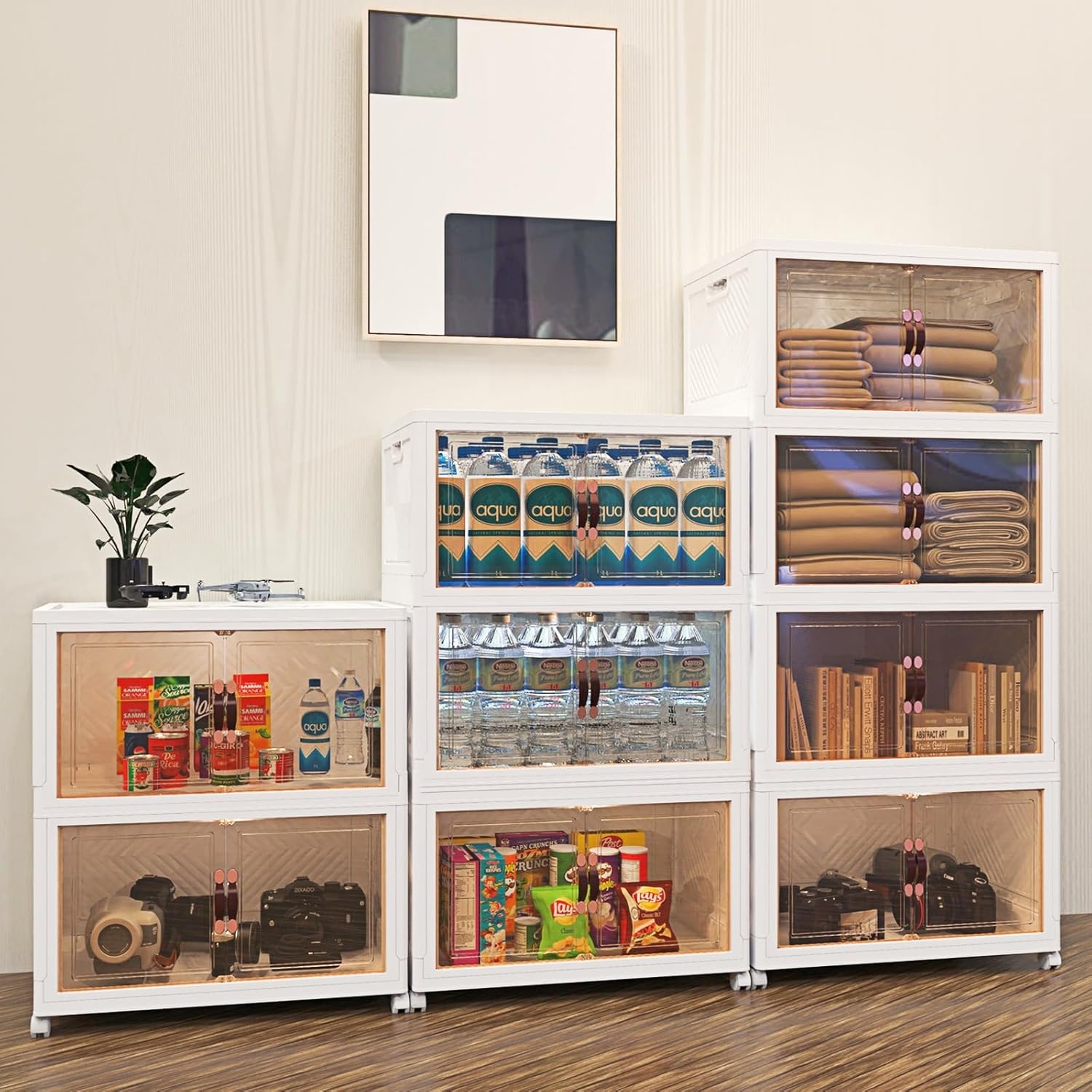 - Double door and Visual Design: This storage bins with lid can be opened from the front doors and the top lid,and the 2 opening ways are convenient to access to stuffs from different directions.The top lid is easy to quick access to large items,such as clothes and blankets.Powerful magnets are built into the front door, so you don't have to worry about the door opening on its own.The door uses a coffee color transparent material, so that the clear storage bins can be visualized, so that you can quickly find the items you need, saving your time.