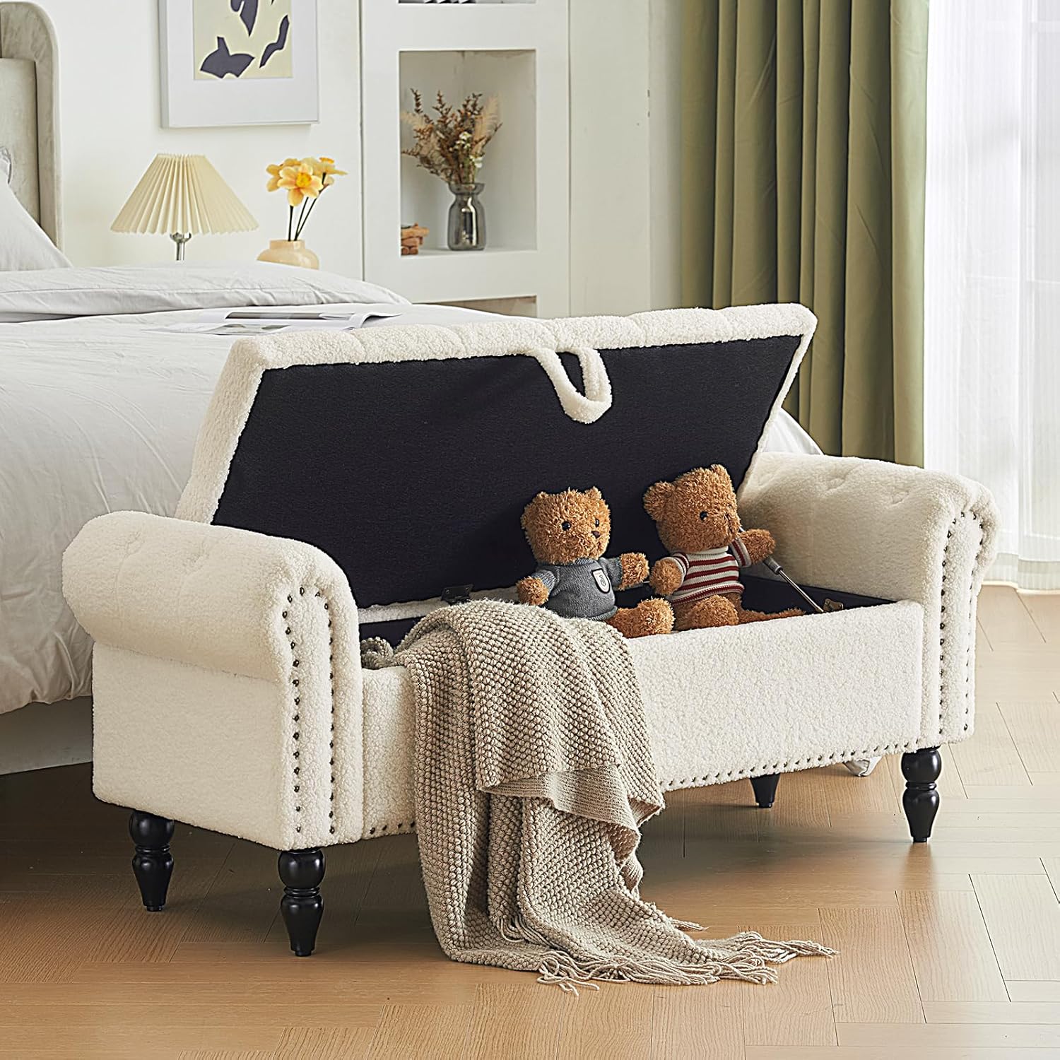- [Mid-century Modern Bench] -Inspired by modern mid-century design concept, our upholstered bedroom storage bench end of bed features a foam-padded seat with high-quality faux fur. Rolled arms, button tufts and a luxurious nail head trim offer a nice finishing touch.