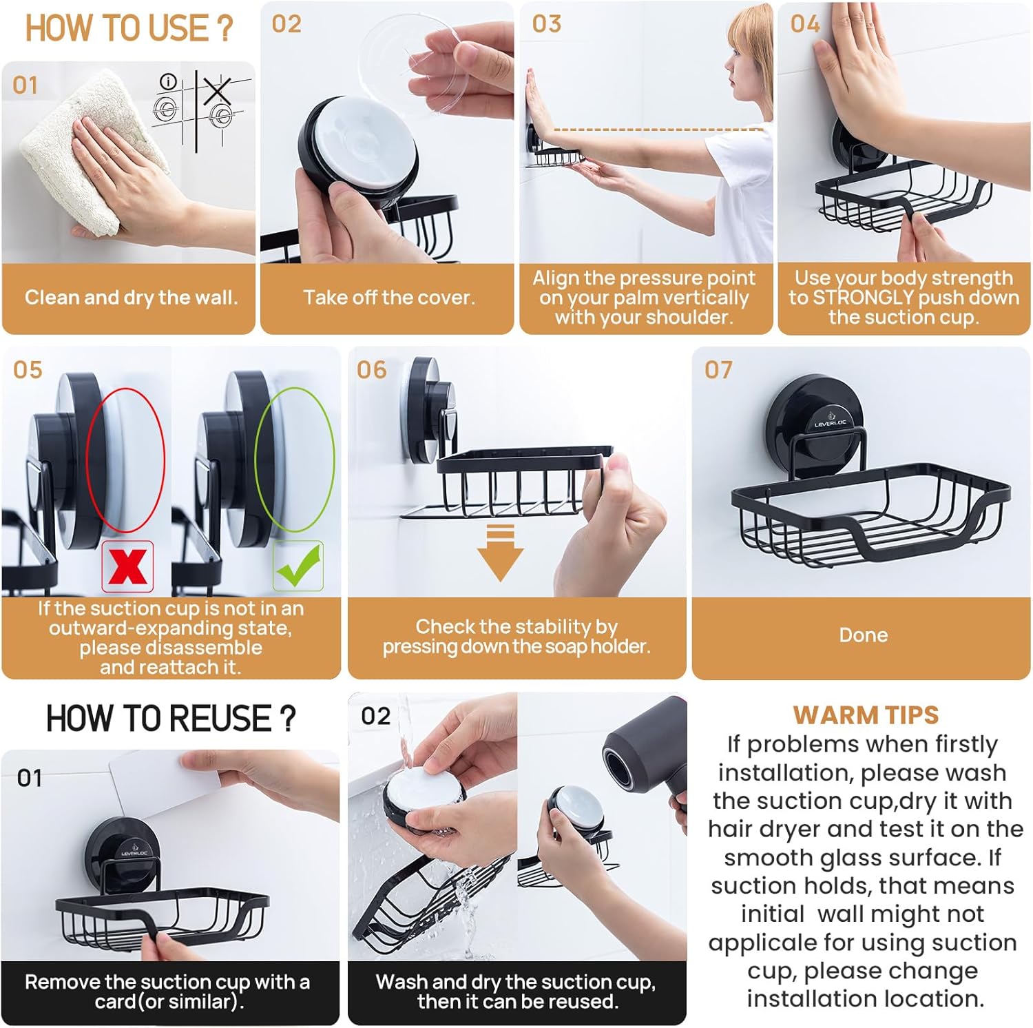 - PATENTED PRODUCT & SUPER SUCTION POWER: Suction cup with patent bionic design of octopus tentacles have powerful suction and superior durability. It is waterproof and oilproof. The suction cup soap dish for shower wall can hold up to 11 LBS, is so stable and durable