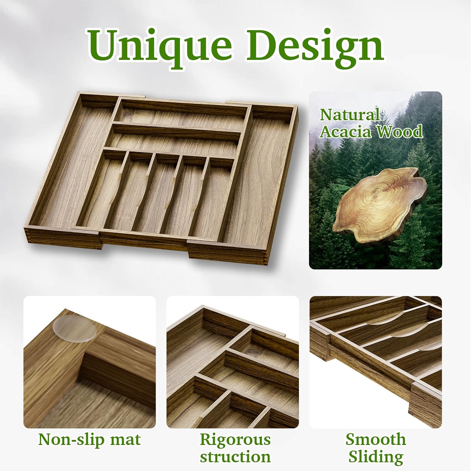 - 𝐍𝐚𝐭𝐮𝐫𝐚𝐥 𝐀𝐜𝐚𝐜𝐢𝐚 𝐖𝐨𝐨𝐝-Made of acacia wood, this silverware drawer organizer is very attractive, well made and easy to clean. More resistant than plastic and other materials. The color of natural wood is so beautiful and rich.