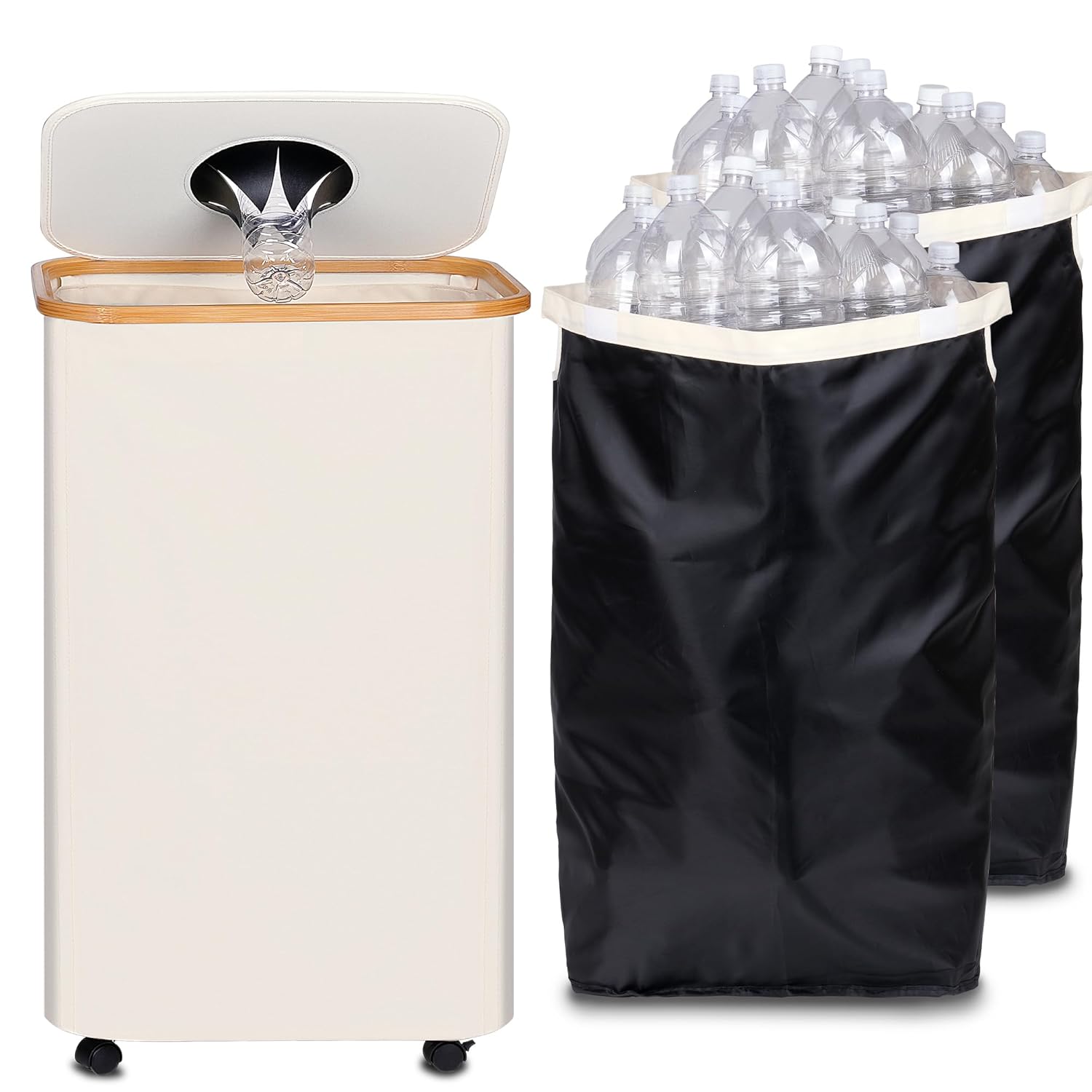 - 【Easy to install】You only need to install the support rods in the 4 corners and fix them under the bamboo basket to easily install the bottle collector. You can easily assemble or fold this recycle bin. At the same time, the lid can prevent odors, keep your room clean and tidy, and provide more storage space.
